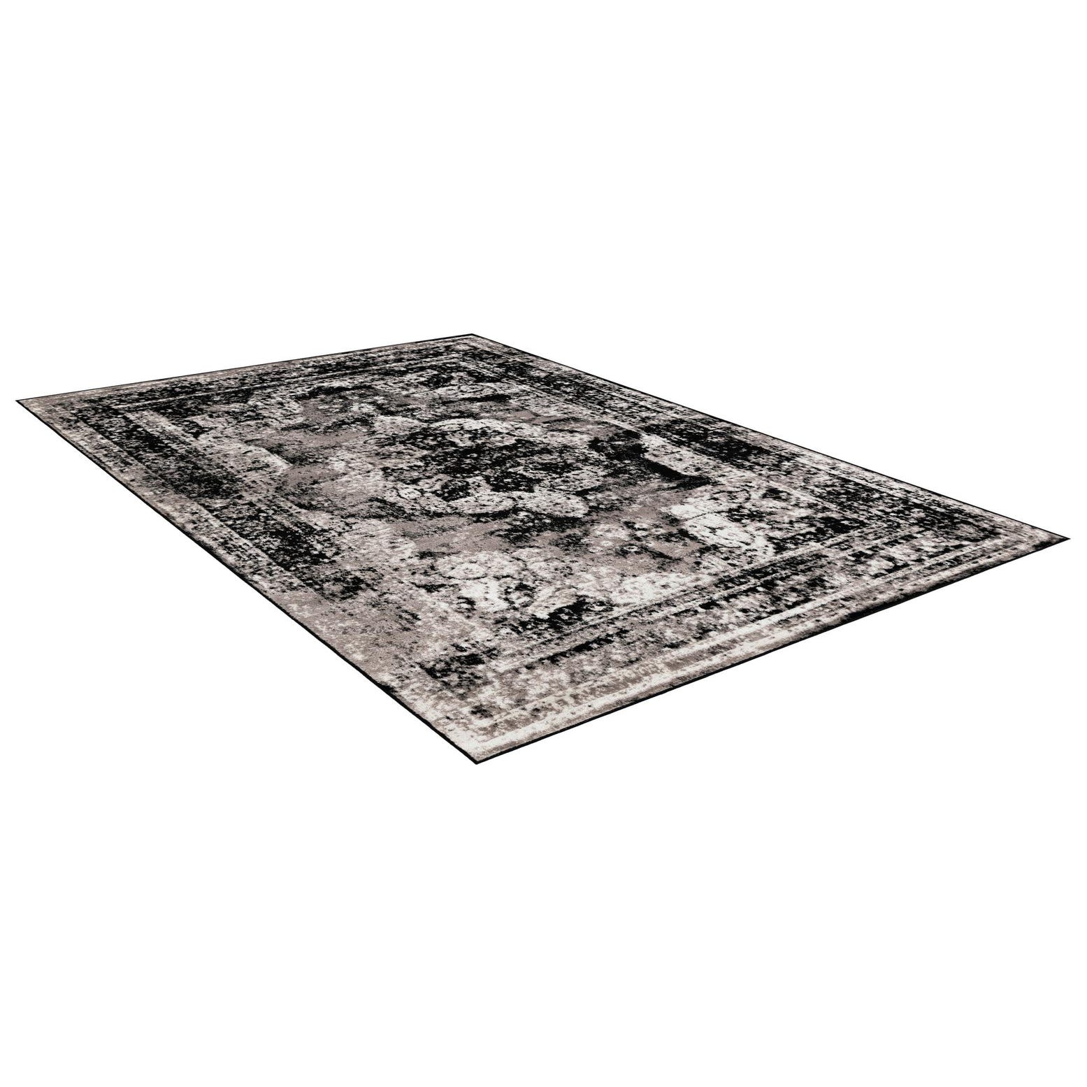 A 6x9 rectangular Monte Carlo rug featuring a distressed black, grey, and off-white medallion pattern, ideal for a living room.
