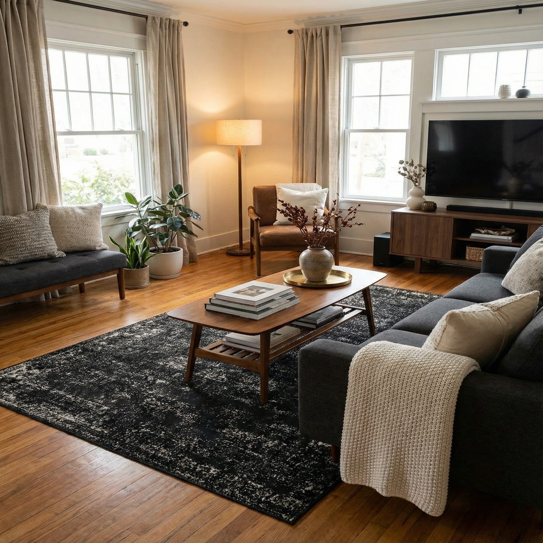 The rug’s monochrome palette and faded traditional motifs work well in contemporary, industrial, or minimalist interiors. Pair it with leather and metal accents for an urban loft vibe, warm wood and ivory textiles to soften a modern living room, or place it under a bed to anchor a moody, layered bedroom. Its subtle pattern provides visual interest without dominating a space, making it a versatile choice for high-traffic areas and formal seating arrangements alike.