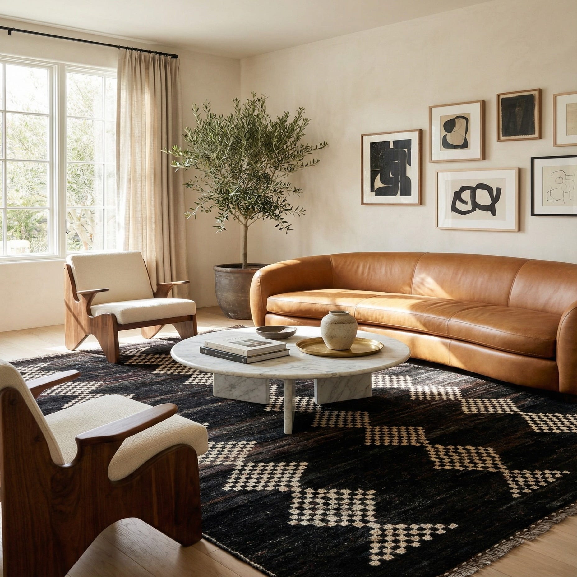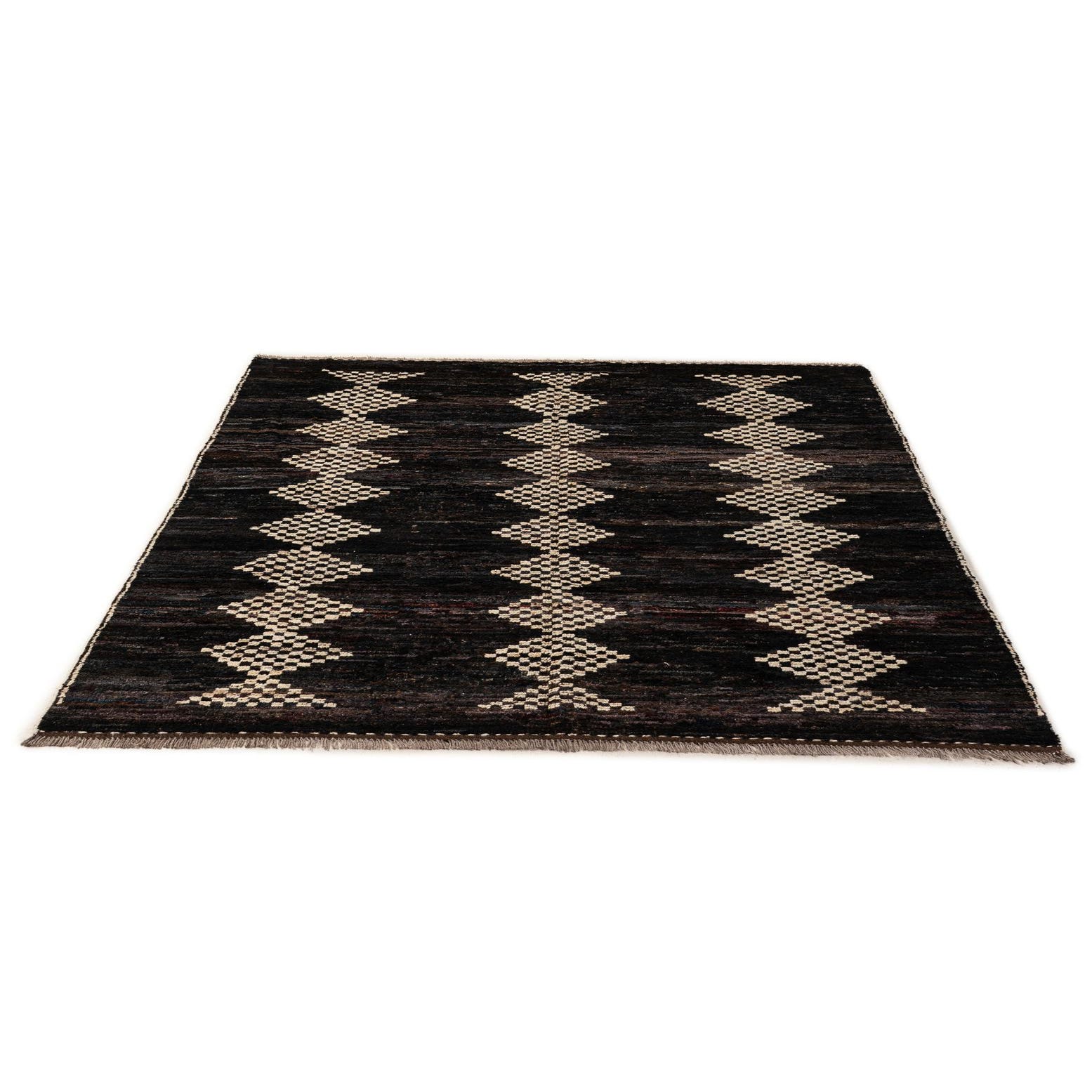 A 6x9 rectangular black wool rug with three vertical columns of cream-colored, checkered diamond patterns, ideal for a living room.