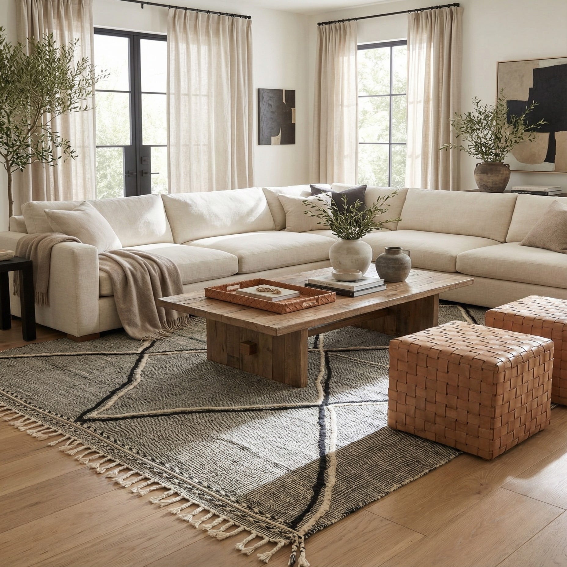 This rug pairs easily with a range of interiors: anchor a streamlined living room to add bold contrast to neutral sofas, layer it over warm wood floors in a mid-century or industrial space, or use it to add graphic interest to a relaxed, bohemian bedroom. Its monochrome palette and clear geometric motif also work well in minimalist entryways or beneath a low coffee table to define a seating area.