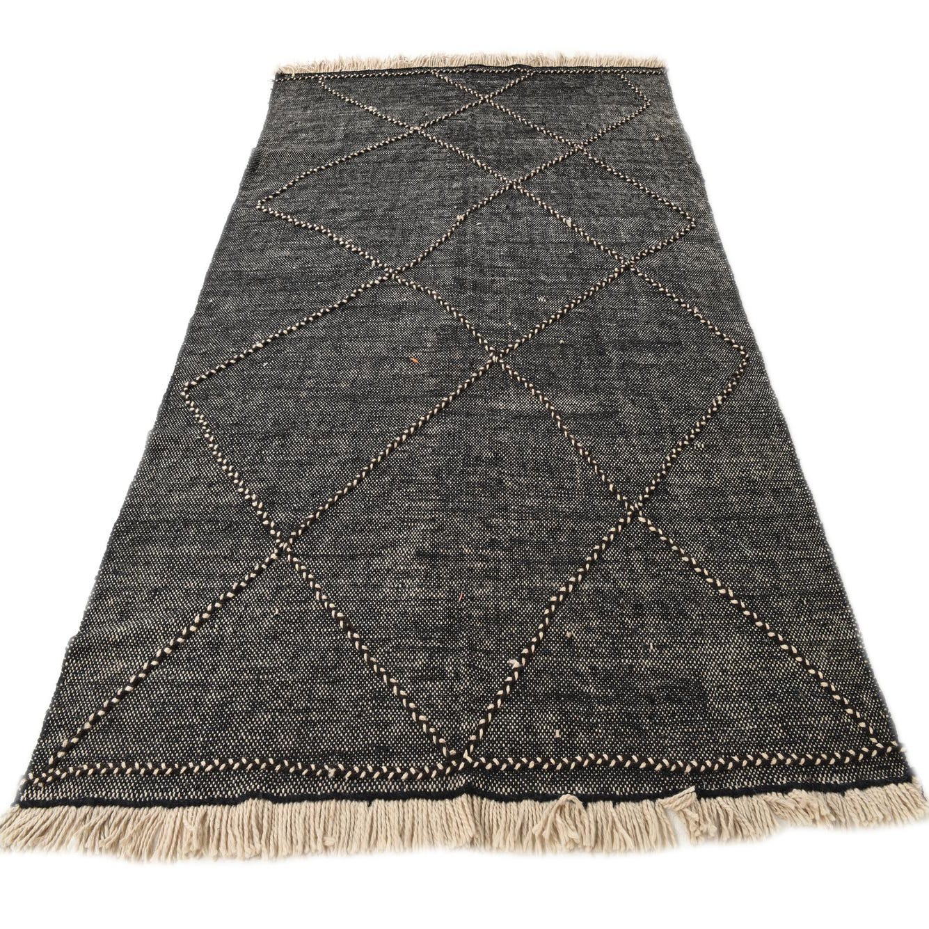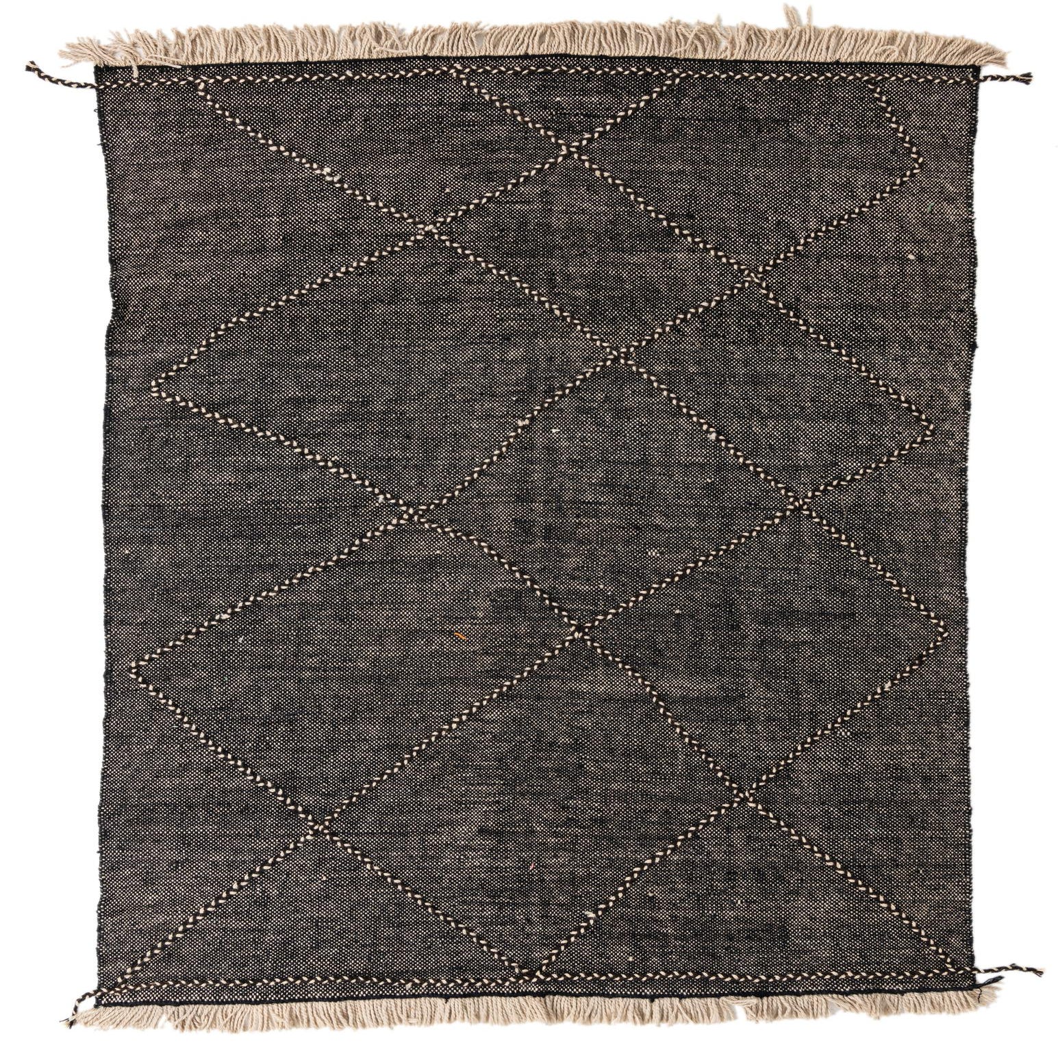 A 6x9 rectangular black wool shag rug with a modern tribal diamond pattern and natural fringe.
