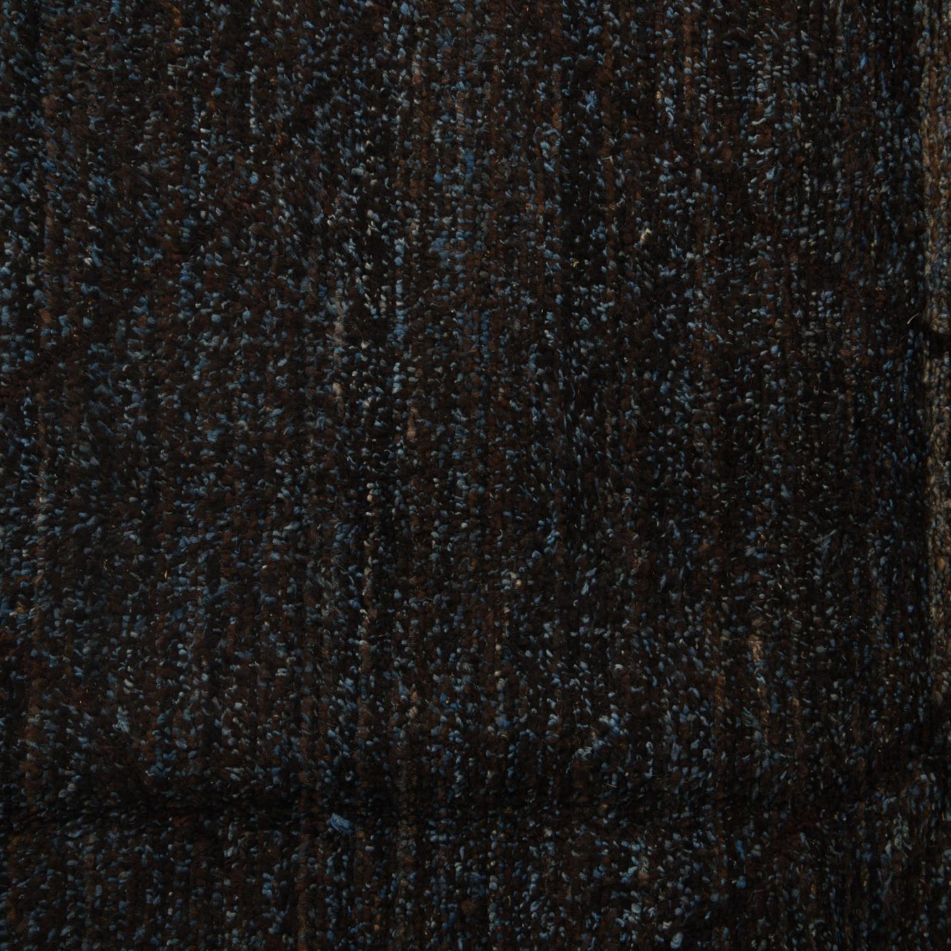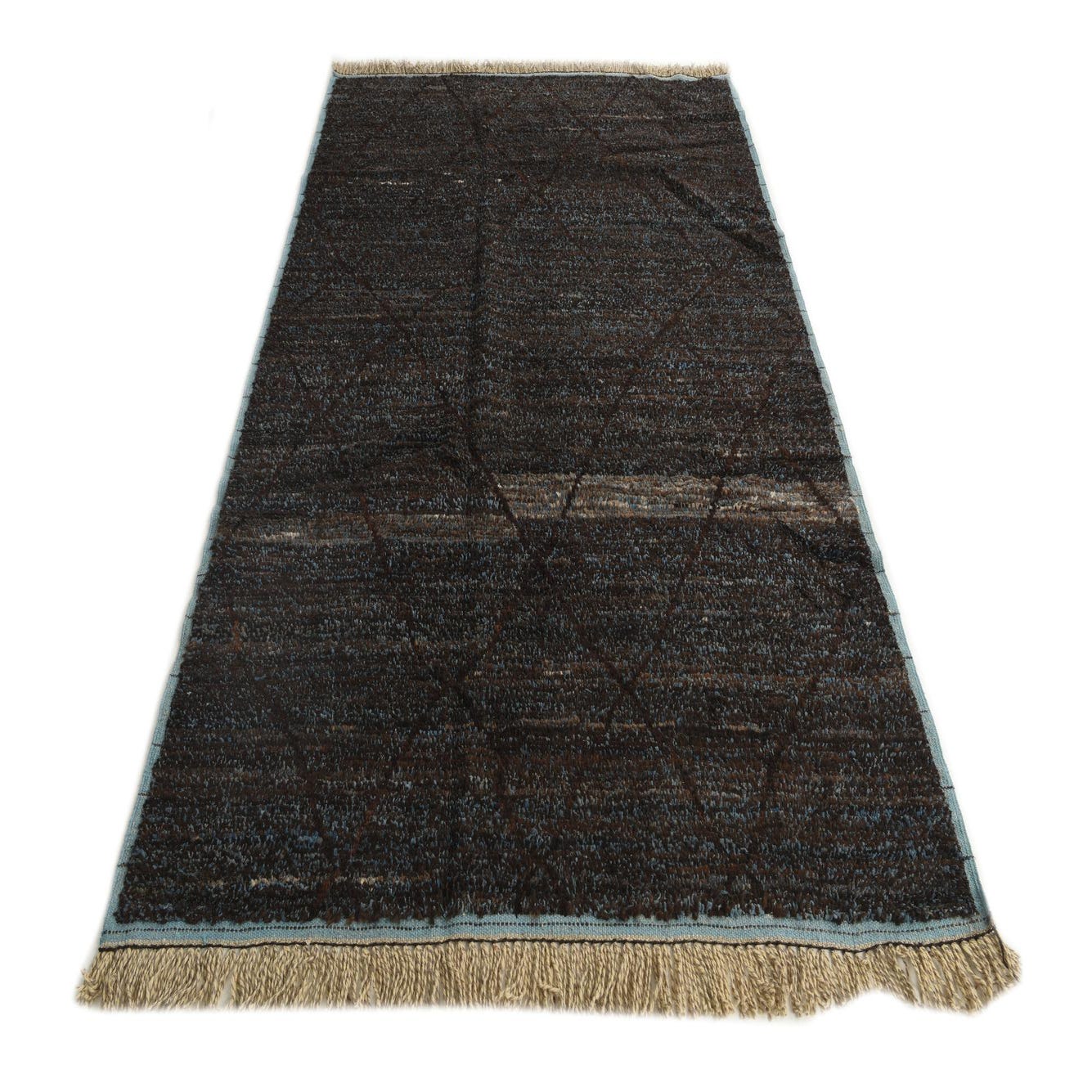 A 6x9 rectangular black shag rug with subtle blue and brown flecks, featuring a faint tribal geometric pattern and natural fringe.