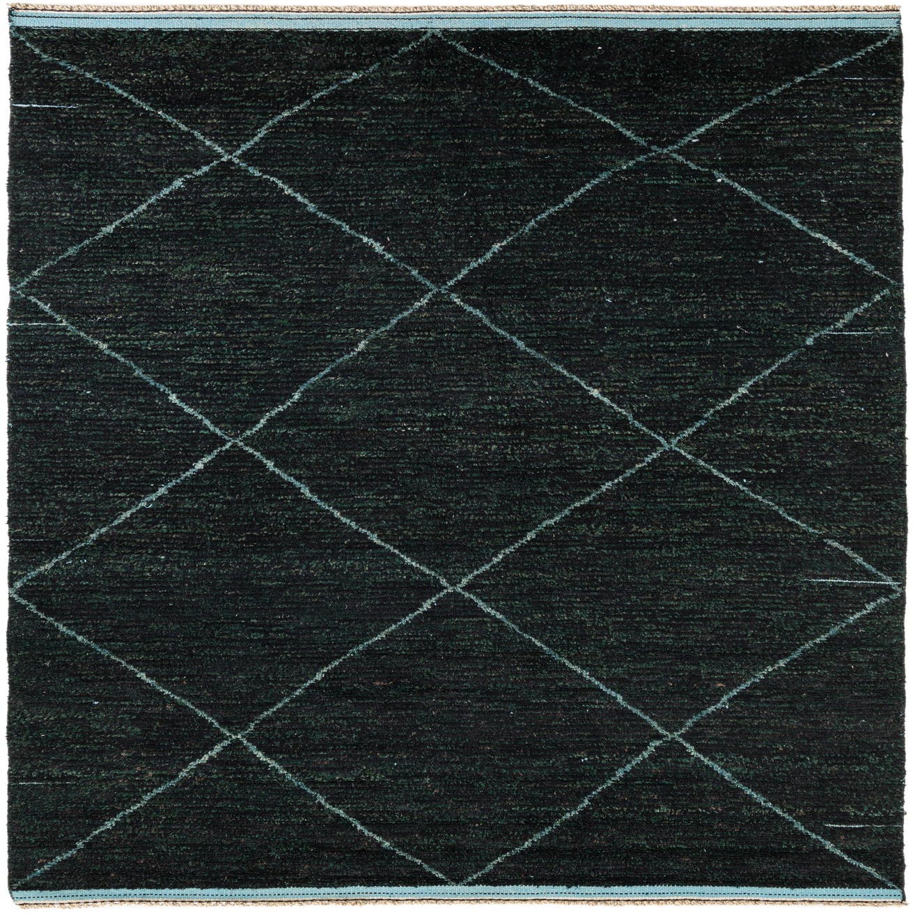 A 6x9 rectangular black shag rug with a subtle light blue tribal diamond pattern, ideal for a living room.