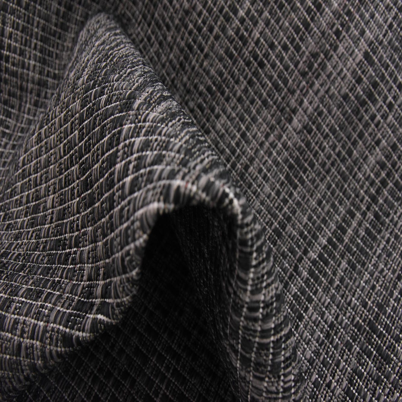 A tightly woven, small-scale crosshatch pattern in beige threads sits over a solid black background, creating a refined, textured look that holds visual interest without a bold motif. Machine-made from 100% polypropylene, the rug has a low-profile, flatweave surface that feels slightly textured underfoot—firm and smooth with a subtle grain from the woven yarns. The neutral two-tone palette and linear pattern give it a modern, pared-back appearance that works well in both indoor and outdoor settings.
