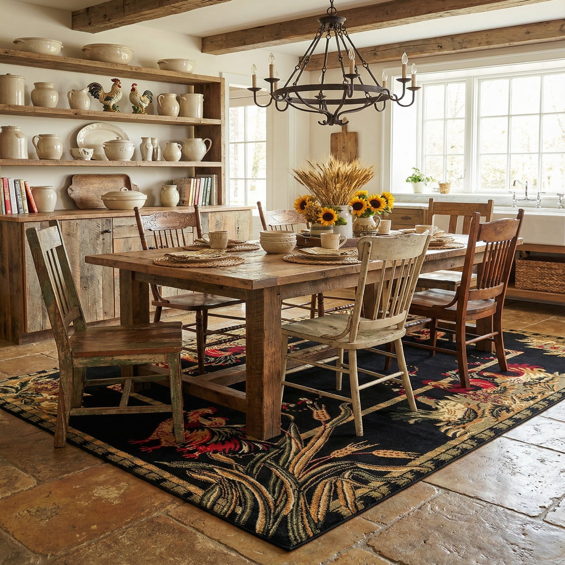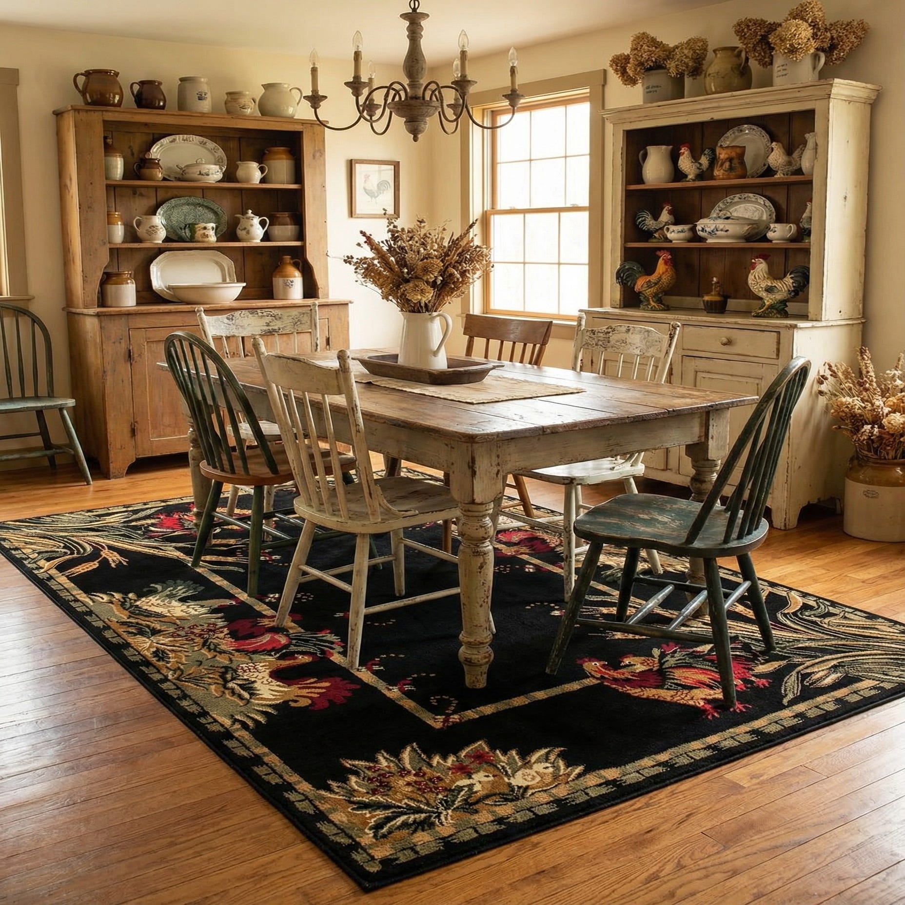 The Pastoral Collection presents a 6x9 area rug that brings a traditional aesthetic to your home with a bold, engaging pattern. The rug showcases a lush display of botanical motifs and ornate designs, echoing classic tapestry styles. A rich color palette includes shades of black, cream, green, light brown, red, rust red, tan, and olive, with black serving as the dominant background color, providing a deep contrast that enhances the visual depth of the design.