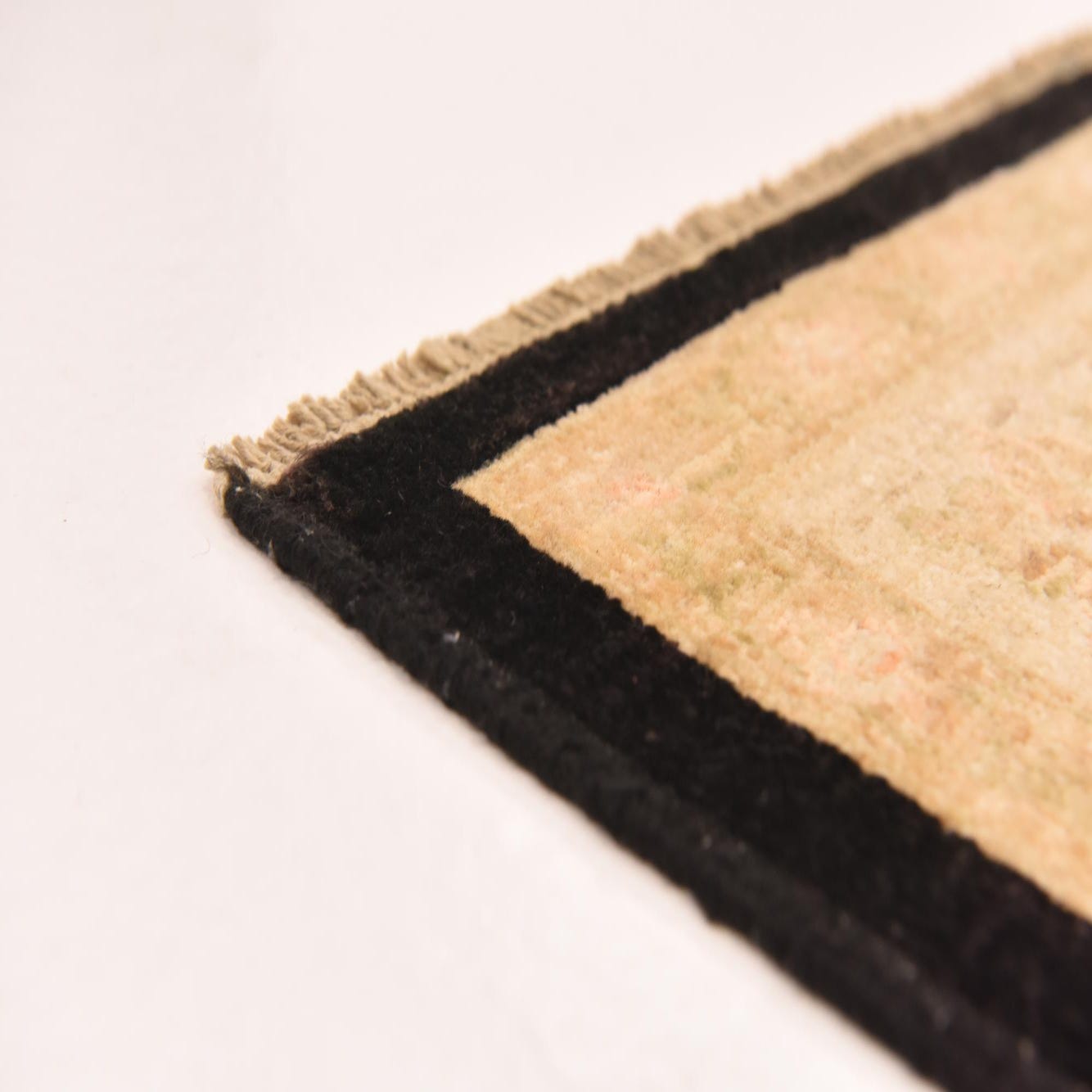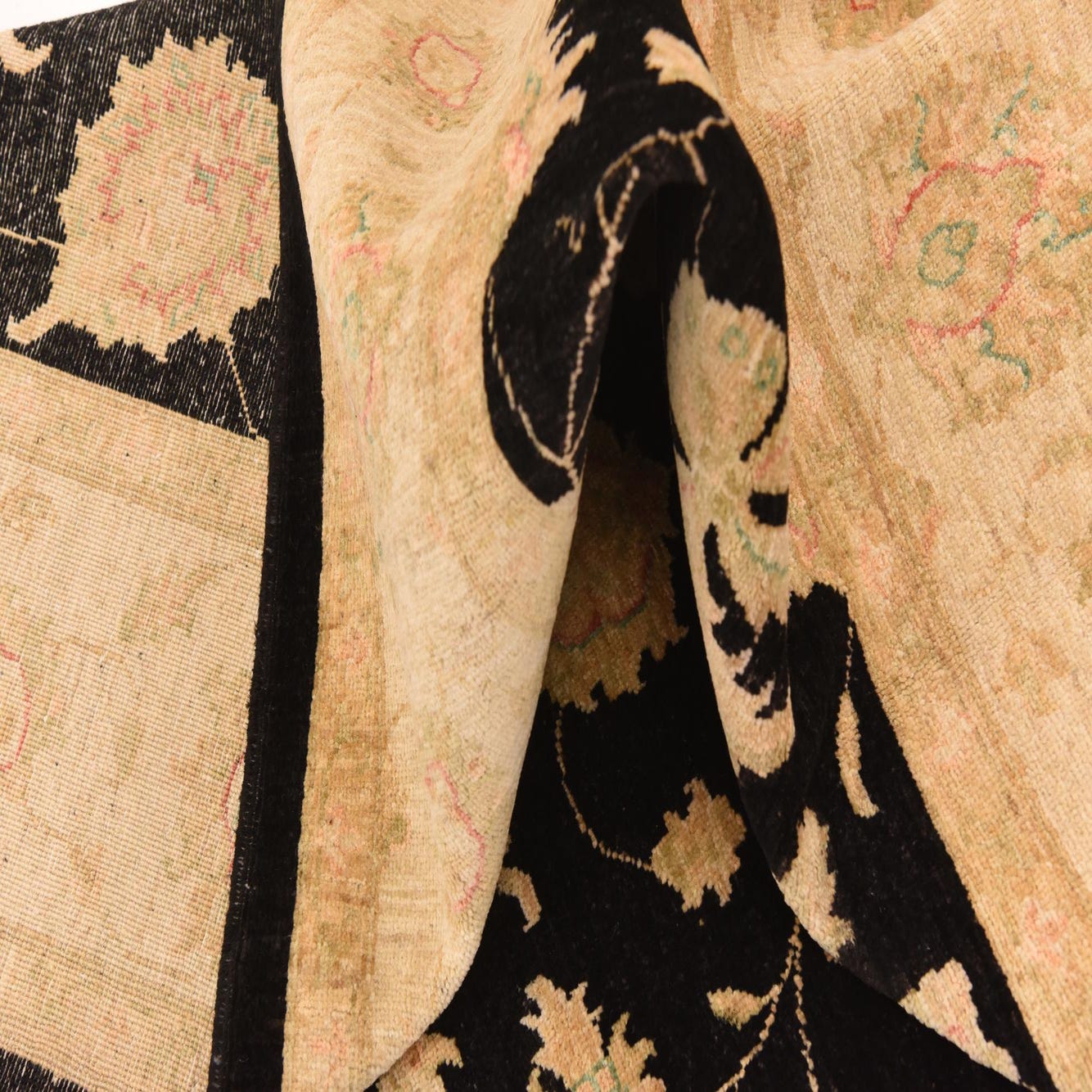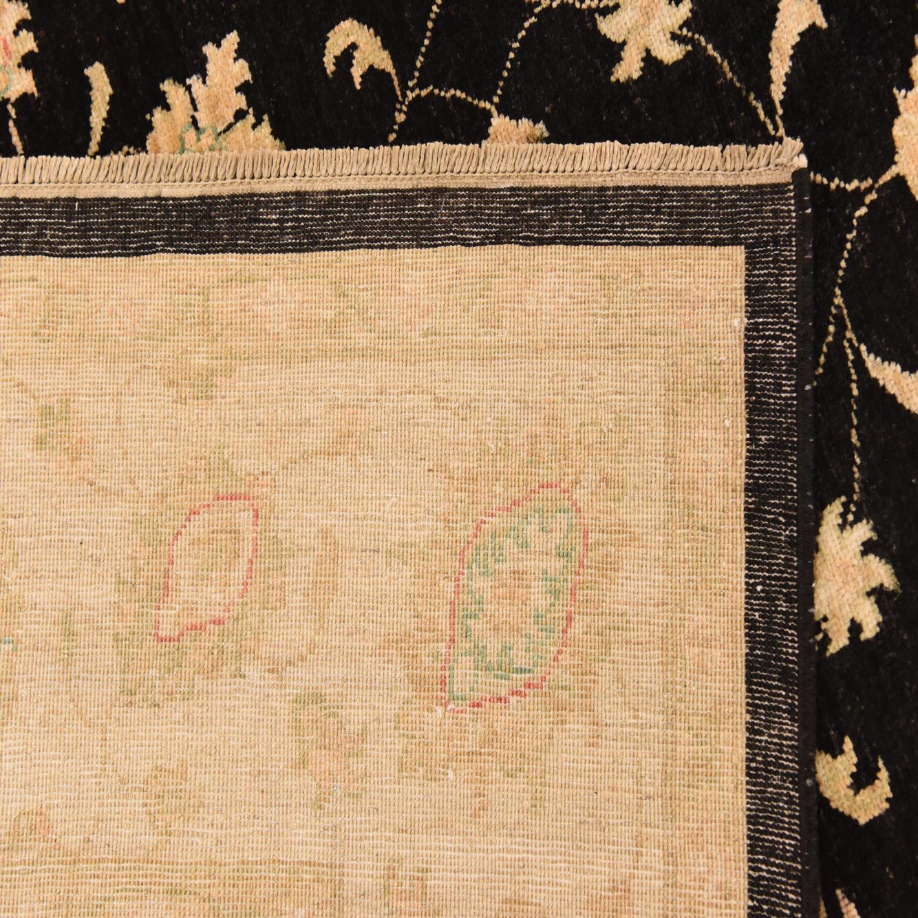 Hand-knotted from 100% hand-spun wool, this rug presents a classic Ziegler-inspired floral field set against a deep black background. Elaborate palmettes and curling vines weave across the center in shades of beige, peach and muted red, with accents of blue, light blue, green and gray that add subtle color depth. A broad beige border with small medallions frames the composition and tempers the dark field with a warm, antique feel.