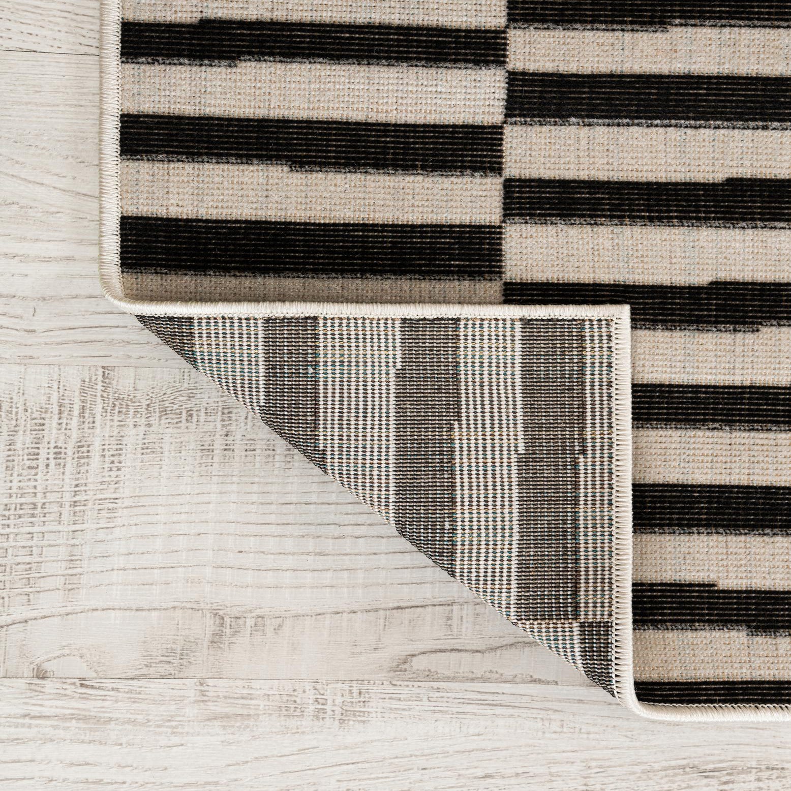 This piece is a fitting addition to contemporary interiors, minimalist spaces, or any setting where a graphic element is desired. Its neutral color palette ensures it can integrate smoothly with various color schemes, from monochromatic to more vibrant decor. Whether it's placed in a living room, dining area, or bedroom, this rug can serve as a grounding element that adds both style and functionality to the environment.