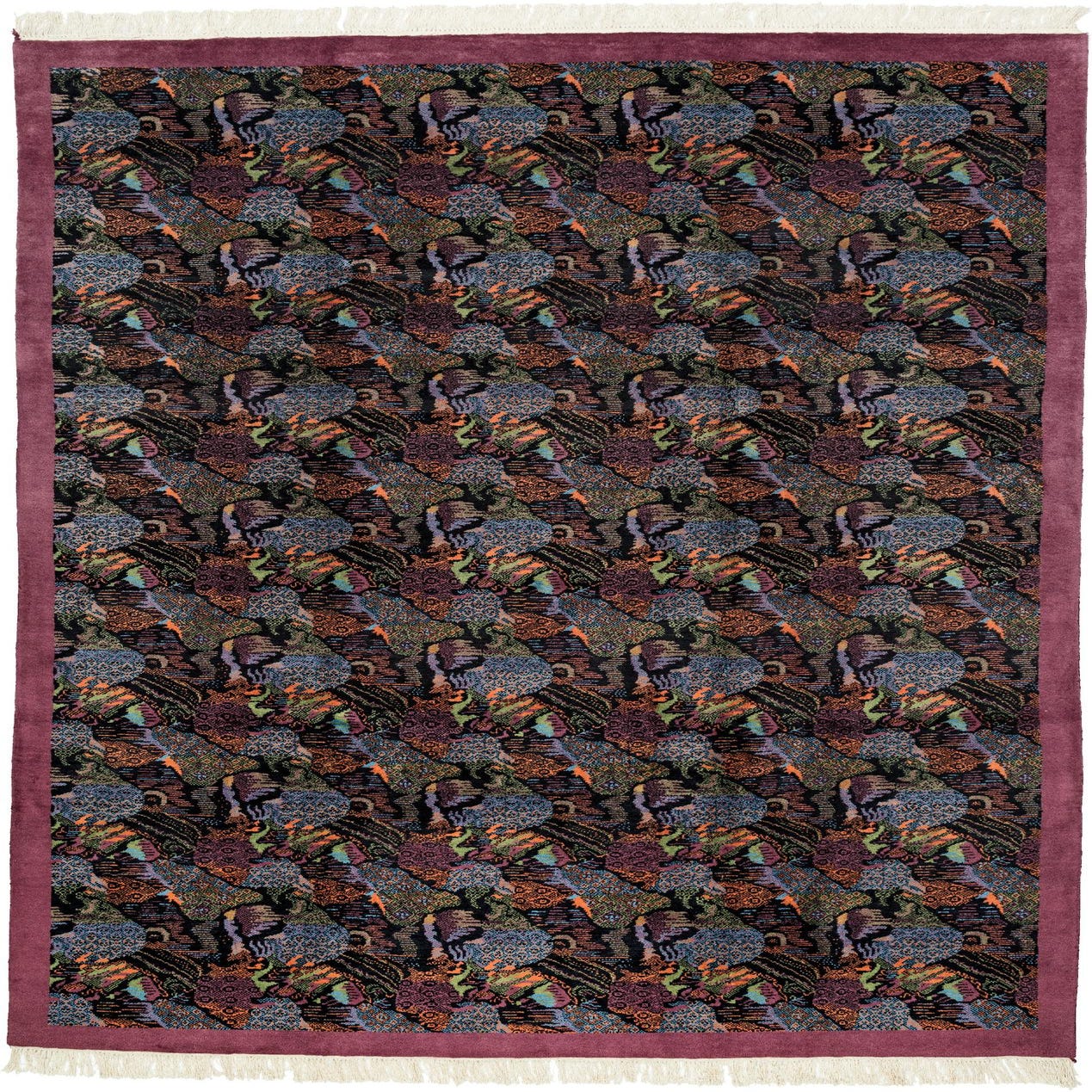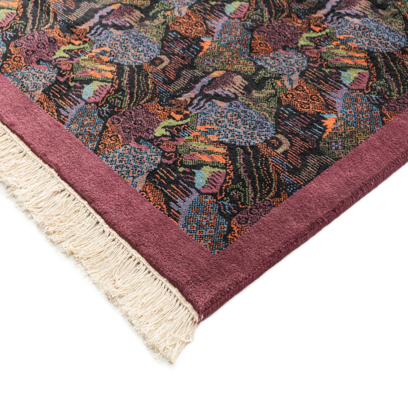 A 6x9 rectangular Tibet Collection rug with a black field, featuring a vibrant, multi-colored modern oriental pattern and a solid plum border with white fringe.