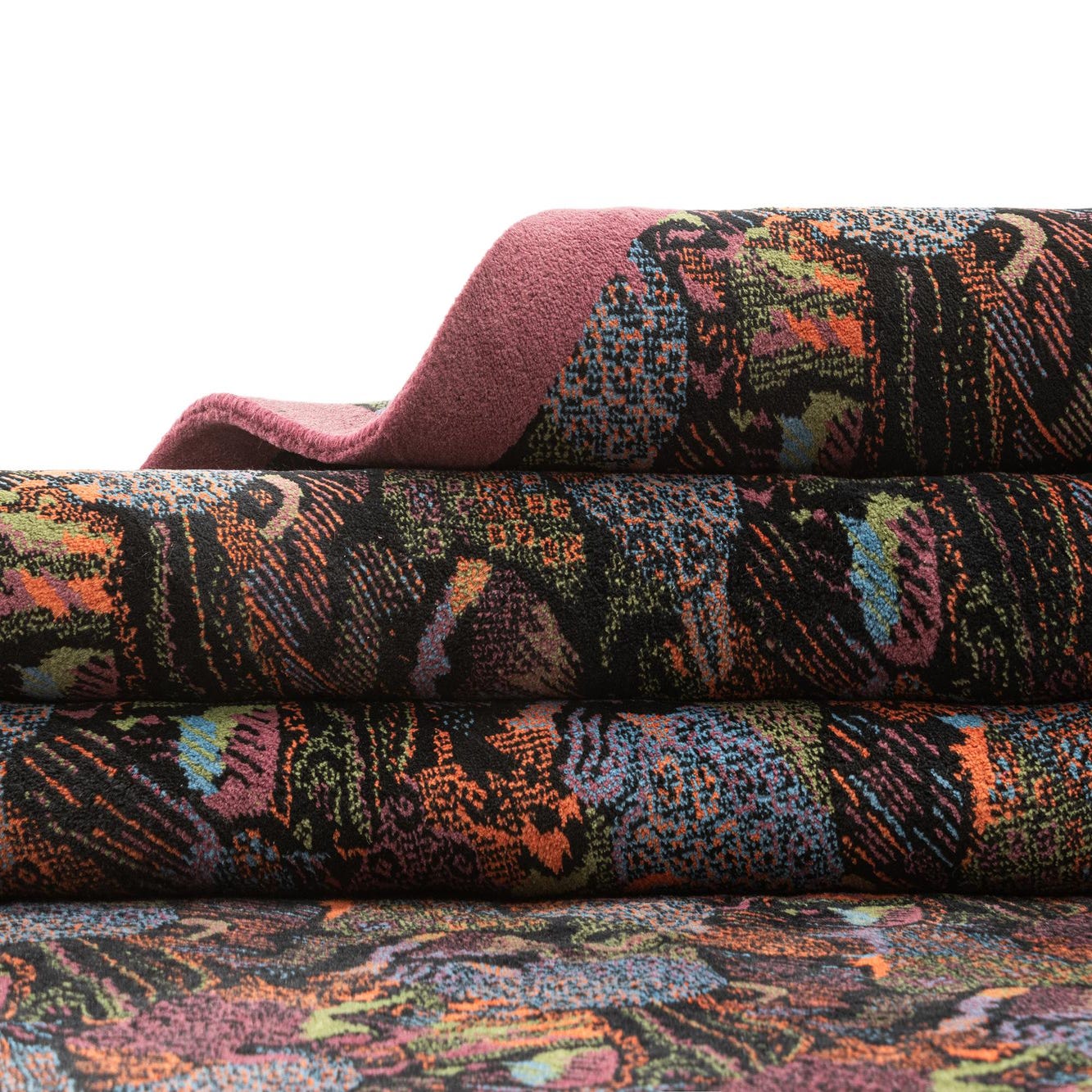 Primary color is Black. Colors in this rug include: Black, Blue, Green, Orange, Purple.