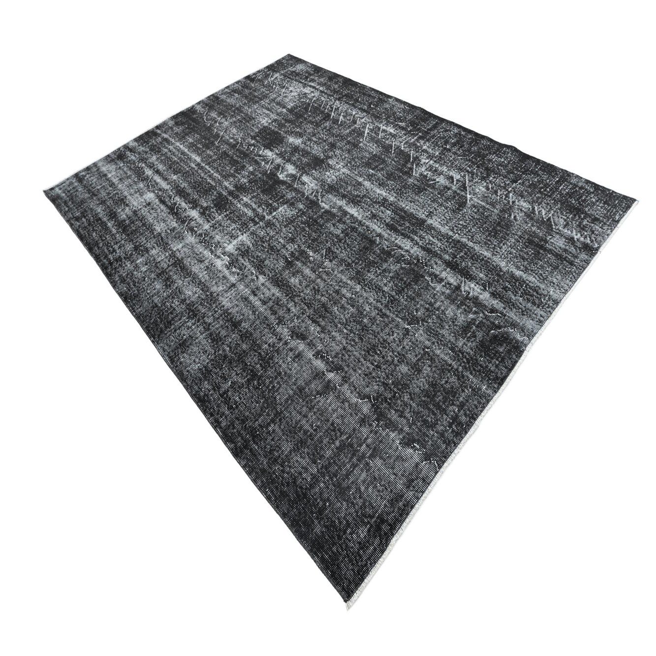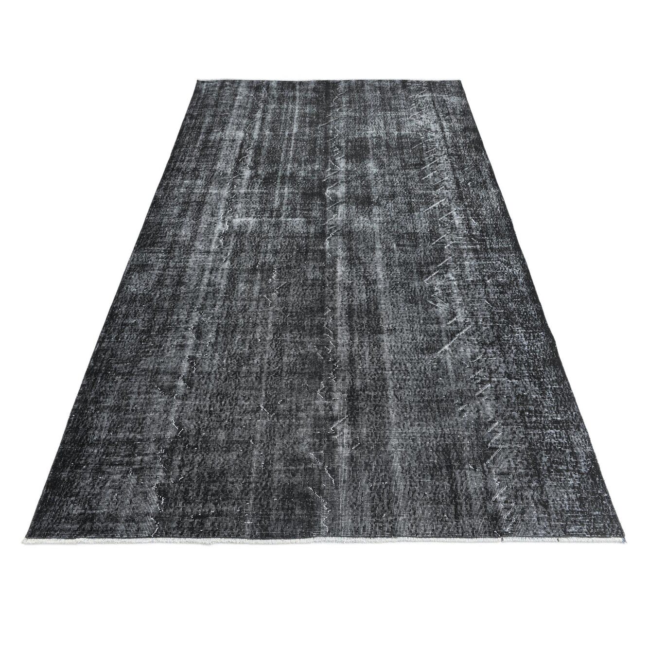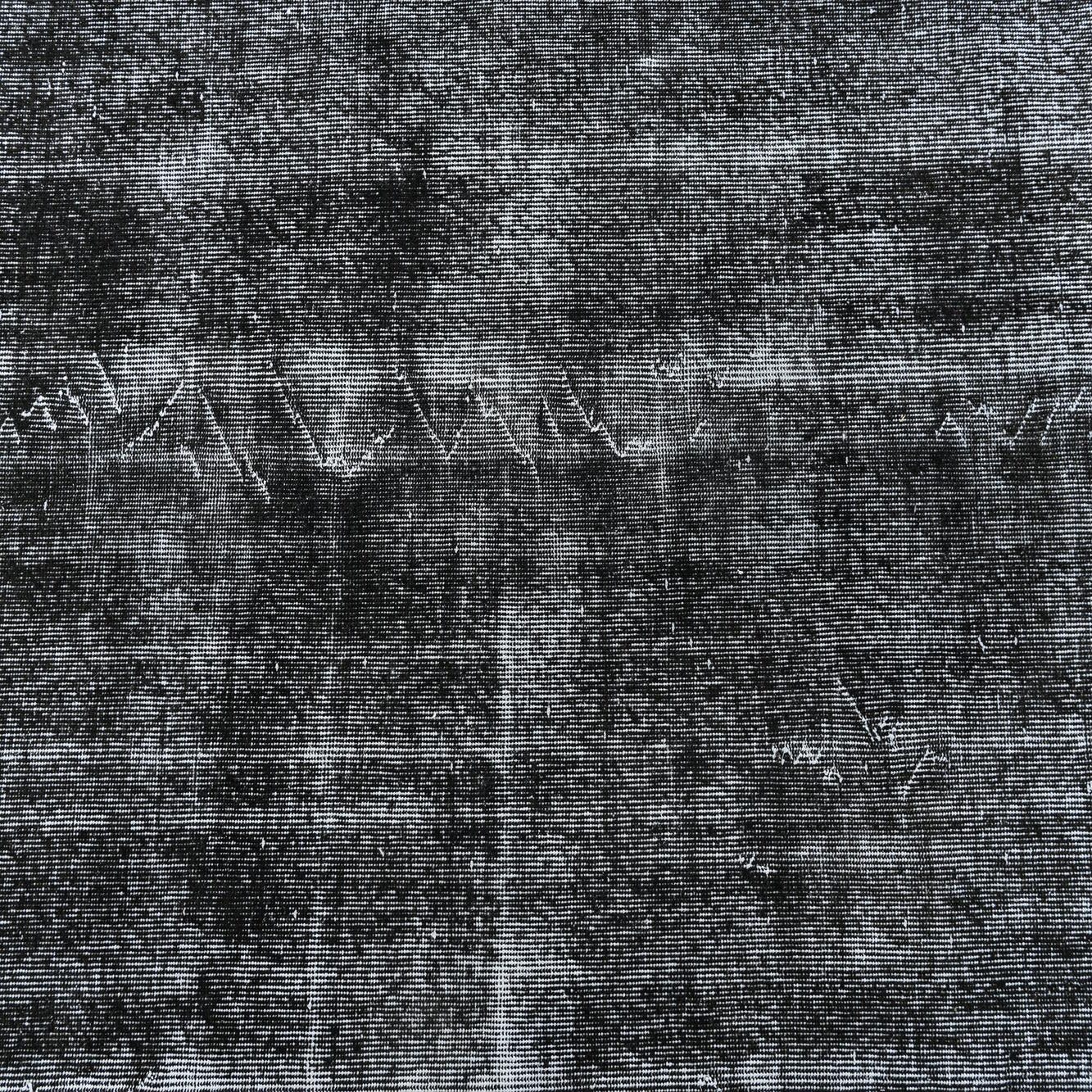 This Ultra Vintage 6x9 handmade rug is crafted from 100% wool, ensuring both durability and a soft underfoot texture. The design displays a dynamic interplay of black, gray, and silver hues, with a deep black background that anchors the piece. Subtle variations in tone and a deliberate distressed pattern give this rug its aged yet timeless appeal, resembling the character of a well-loved heirloom.