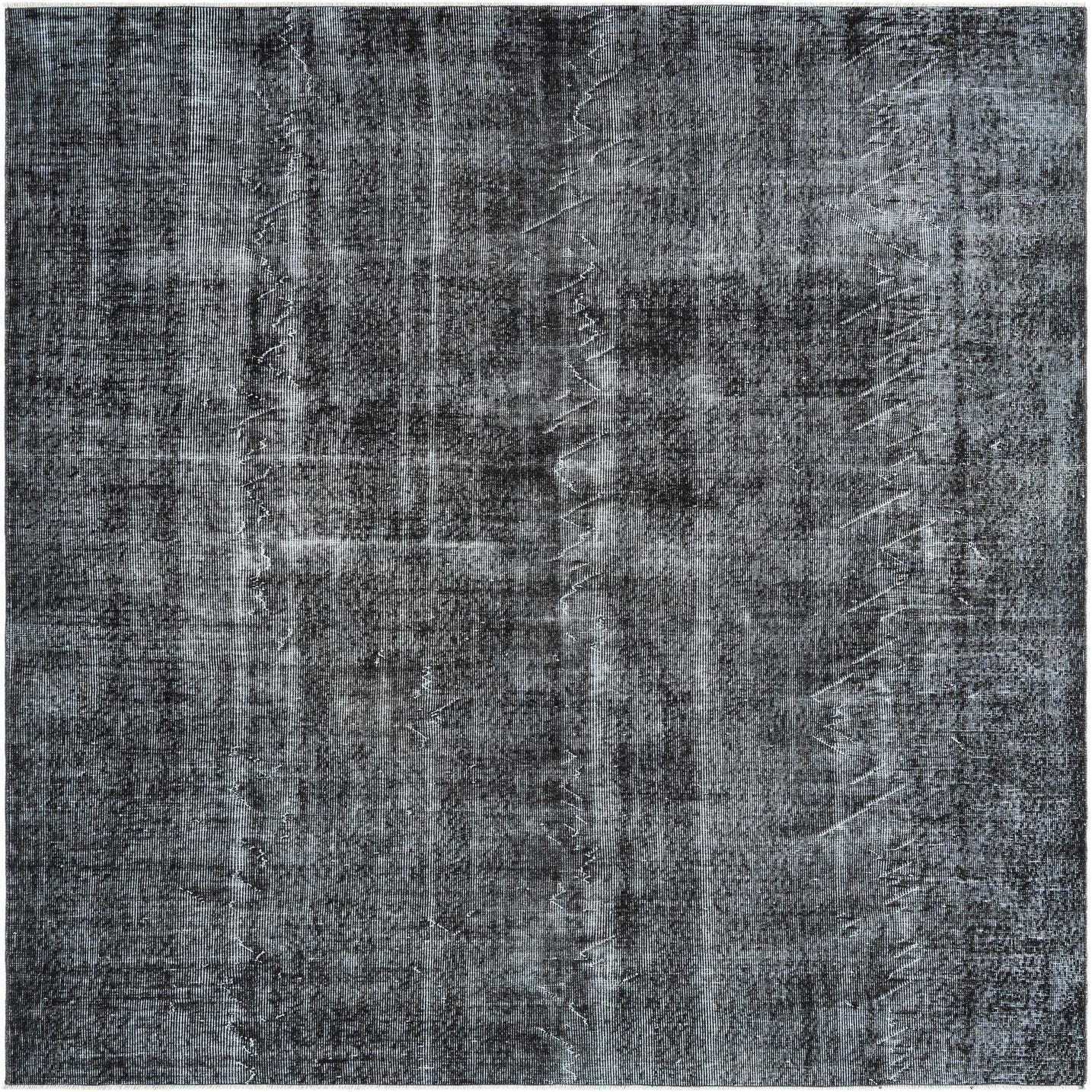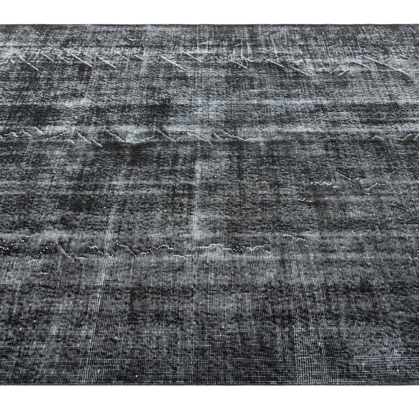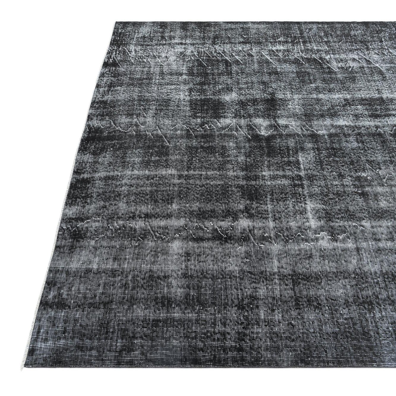 This Ultra Vintage 6x9 handmade rug is crafted from 100% wool, ensuring both durability and a soft underfoot texture. The design displays a dynamic interplay of black, gray, and silver hues, with a deep black background that anchors the piece. Subtle variations in tone and a deliberate distressed pattern give this rug its aged yet timeless appeal, resembling the character of a well-loved heirloom.
