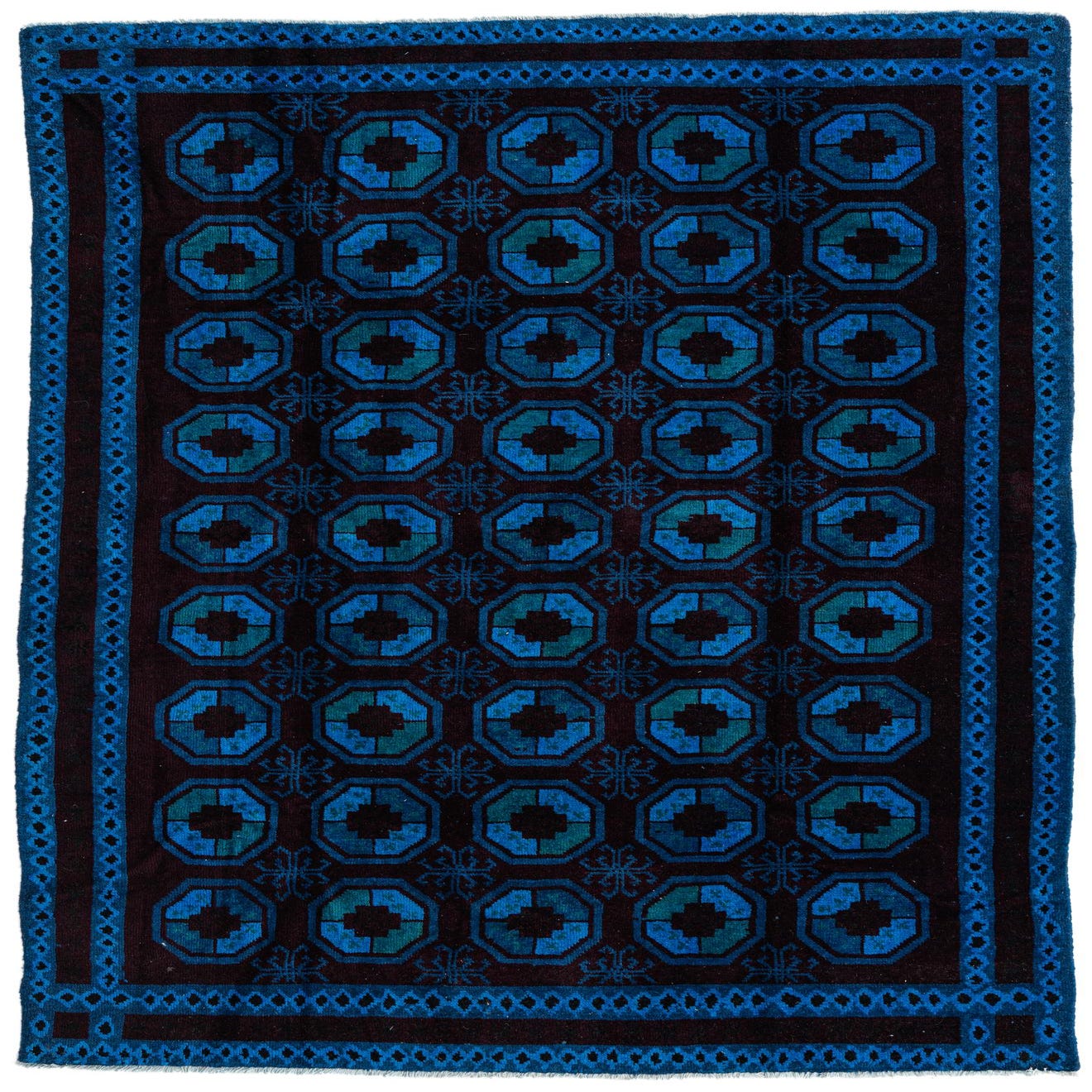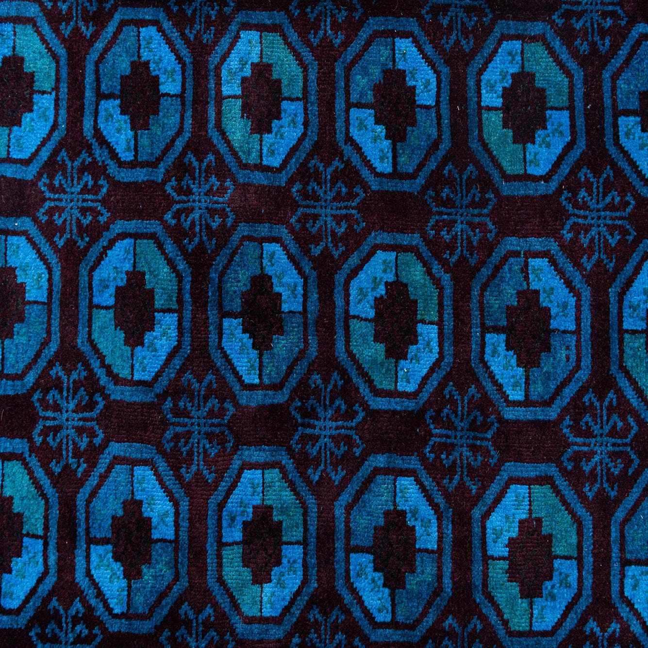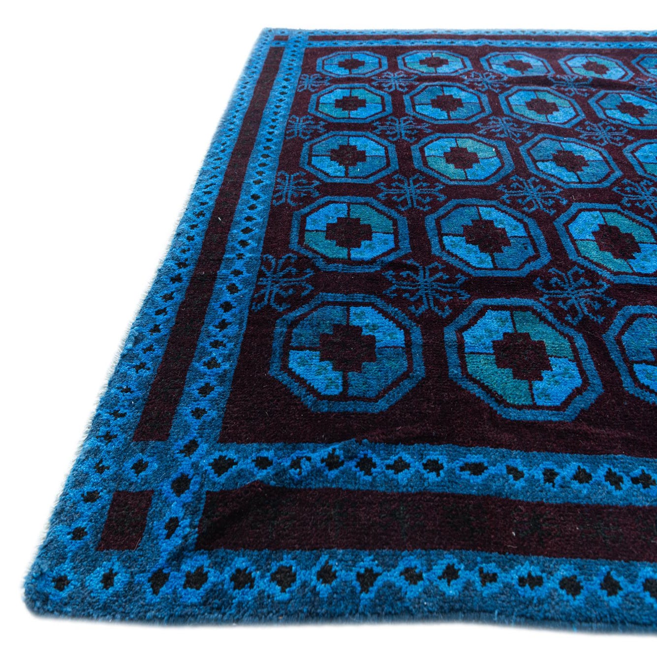 A 6x9 rectangular Ultra Vintage rug featuring a deep black background with a repeating pattern of octagonal shapes in varying shades of blue, framed by a blue border.