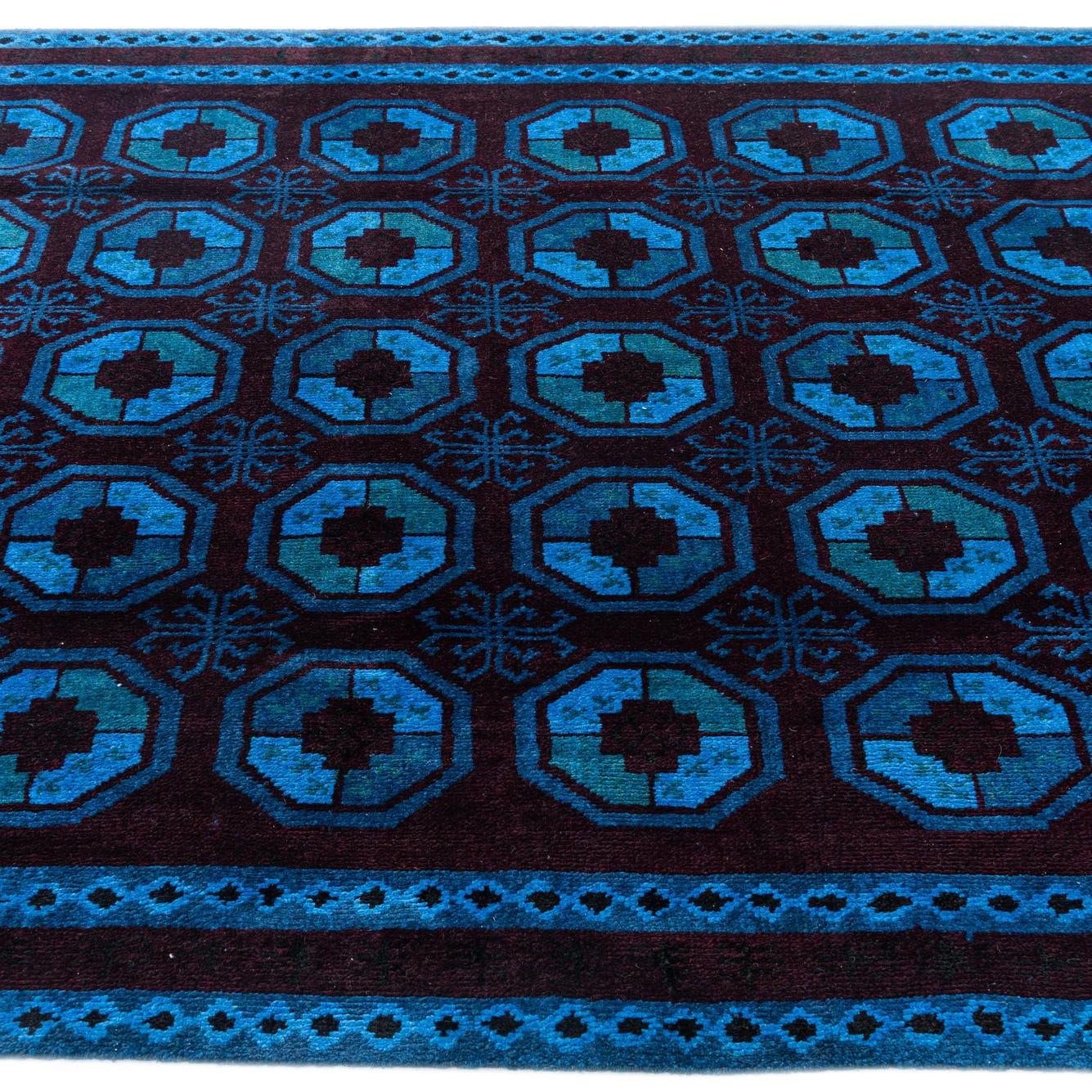 Hand-knotted from 100% wool, this rug presents a black field patterned in a strict grid of octagonal medallions in deep blue with touches of green. The medallions are separated by small floral-cross motifs and set within a narrow multi-band blue border threaded with diamond accents. The dense, hand-knotted wool pile feels substantial and soft underfoot while maintaining a low profile that keeps the pattern crisp and well defined.