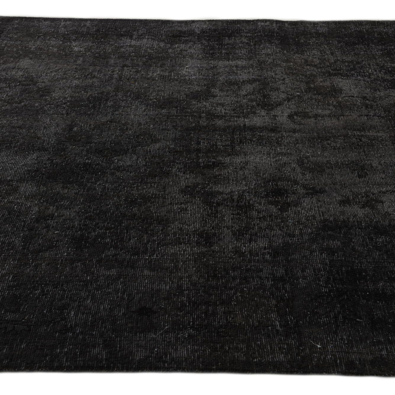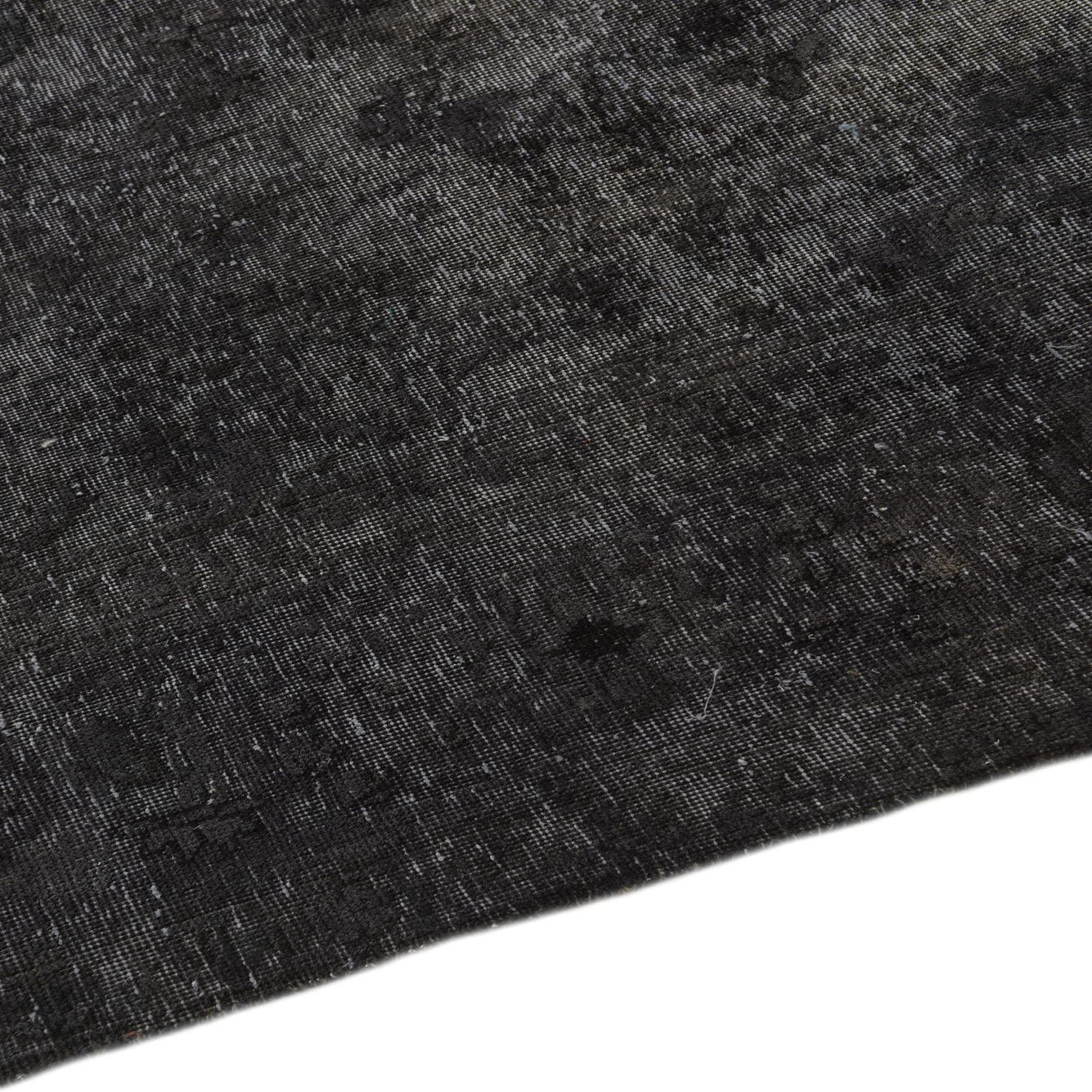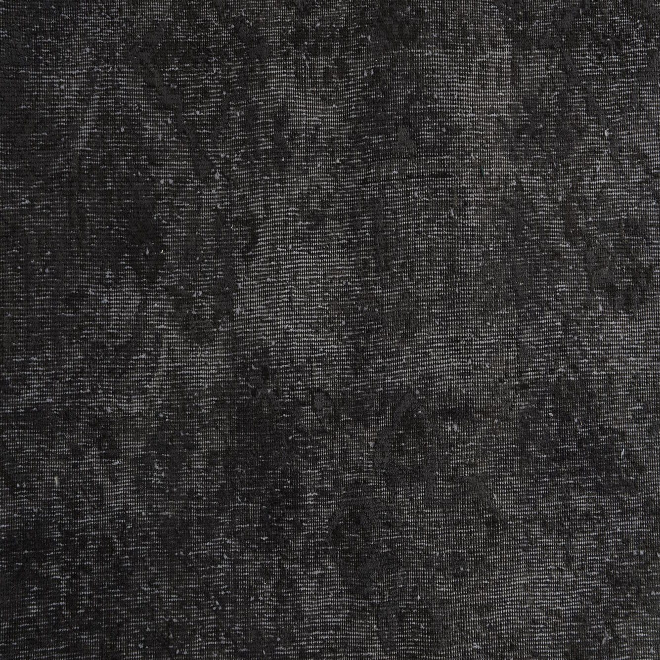 Sporting a sophisticated palette, the rug features a deep black background with subtle gray accents that create a pattern reminiscent of timeless antique textiles. The smooth gradations of color and the gentle wear in the design suggest the look of a well-loved heirloom, imbued with contemporary appeal.