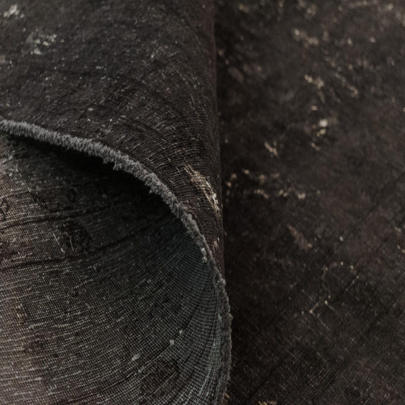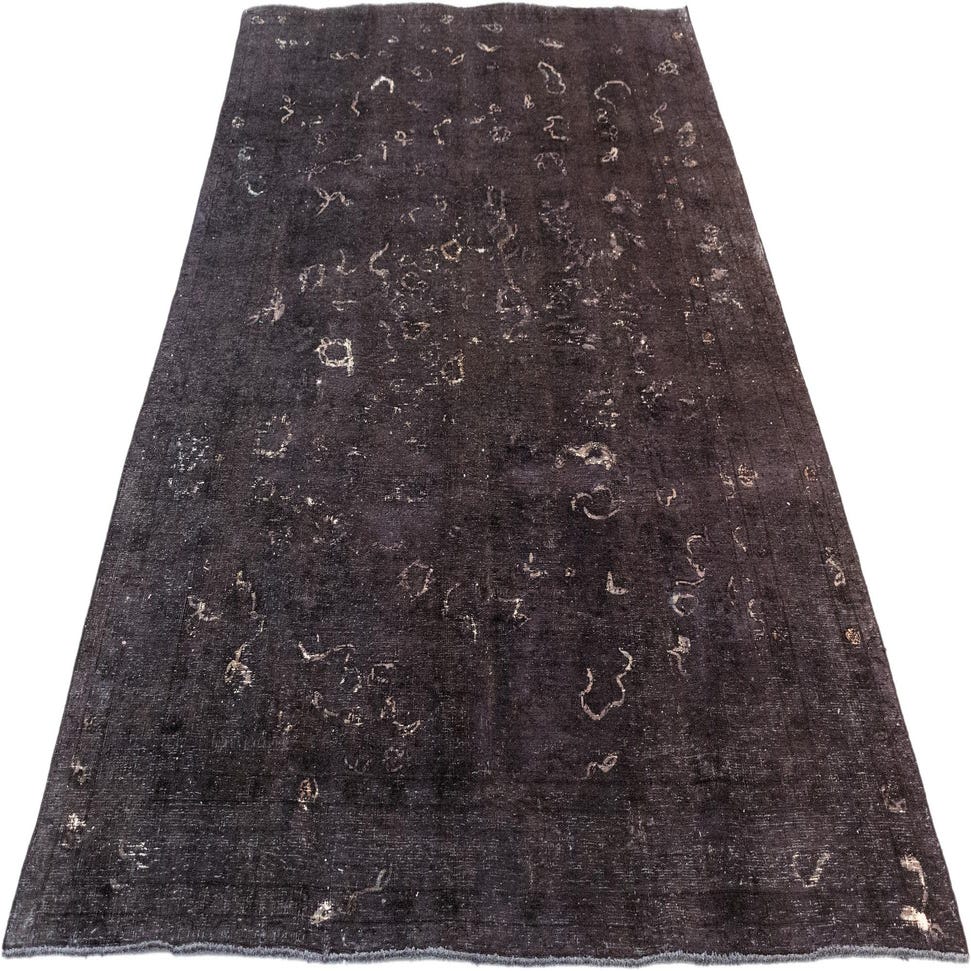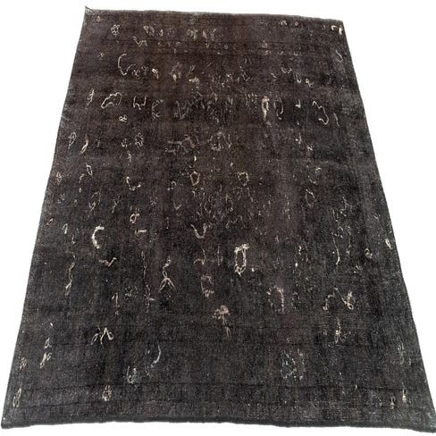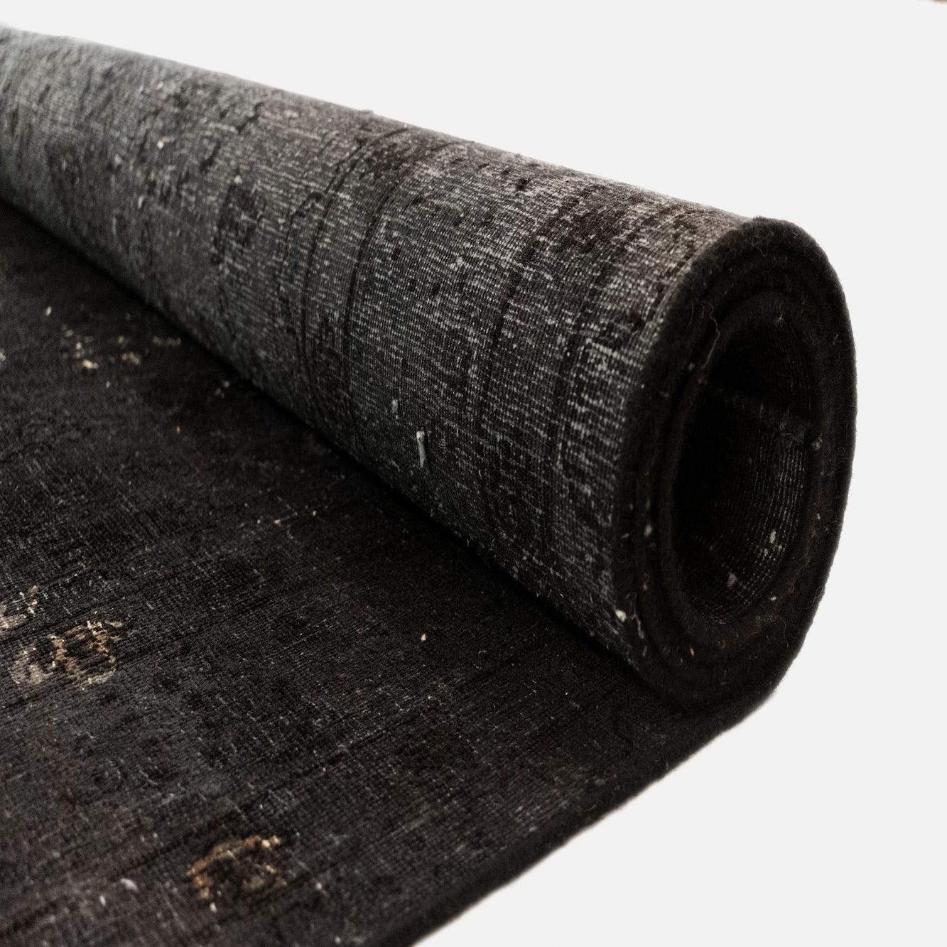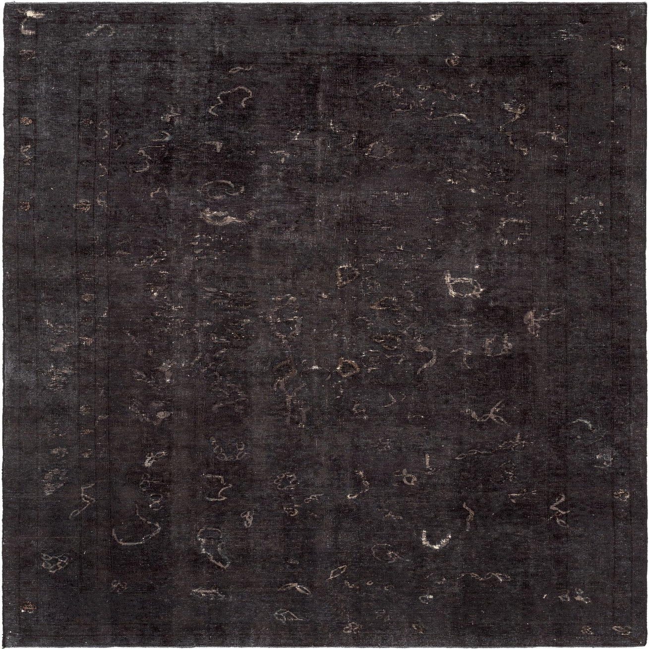 A 6x9 rectangular black Persian wool rug with a distressed vintage pattern, ideal for a living room.