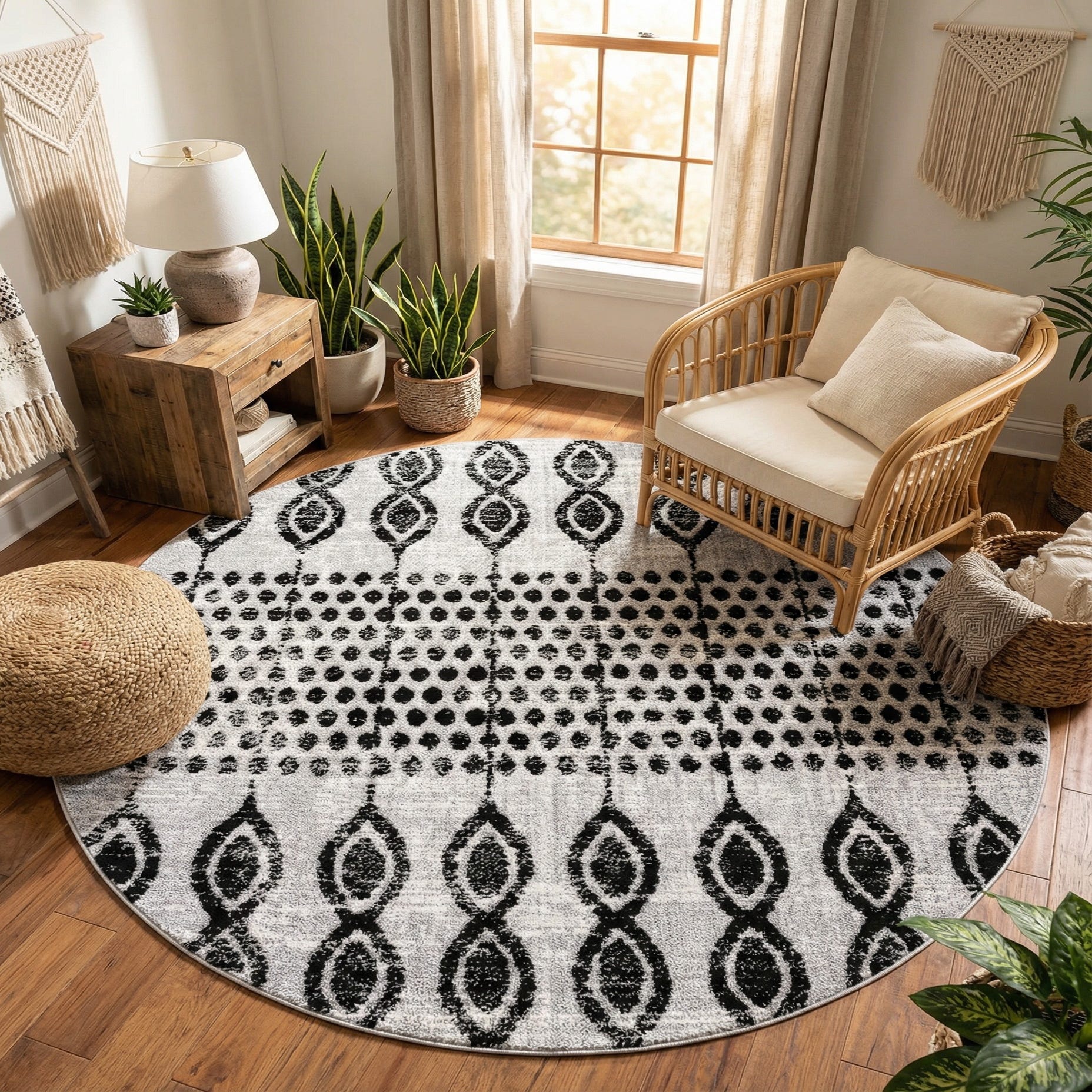 The Cherokee collection presents a 7 ft round rug that is machine woven of 100% polypropylene, offering a durable and practical option for various living spaces. The rug displays a bold and dynamic pattern, featuring an assortment of shapes that create a fluid and organic feel. Its color palette includes black as the primary background hue, enhanced with contrasting gray and ivory details, imparting a sense of depth and movement to the design.