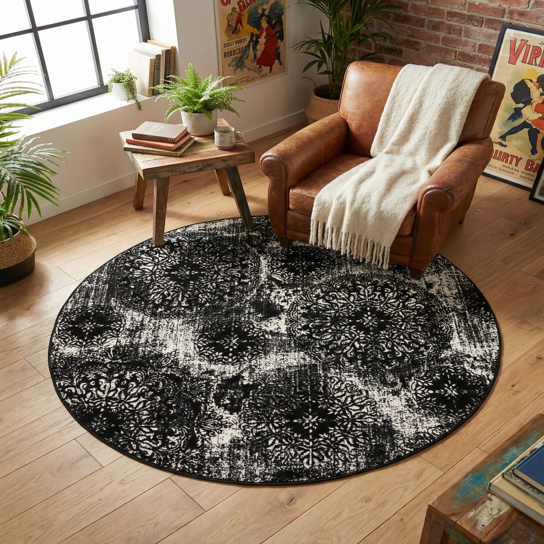 The bold, ornate pattern creates a focal point in any space, making it an excellent choice for living rooms, dining areas, or large entryways where it can serve as the centerpiece of the interior. Its round shape is conducive to creating a sense of intimacy and can help soften the lines of angular furniture, complementing both modern and traditional décor themes. As a stain-resistant and shed-free piece, this rug is practical for areas with high foot traffic and under dining room tables where spills may occur. The striking contrast in color and pattern versatility allows it to slide seamlessly into various design schemes, including monochromatic, minimalist, or even eclectic interiors that call for a dramatic accent.