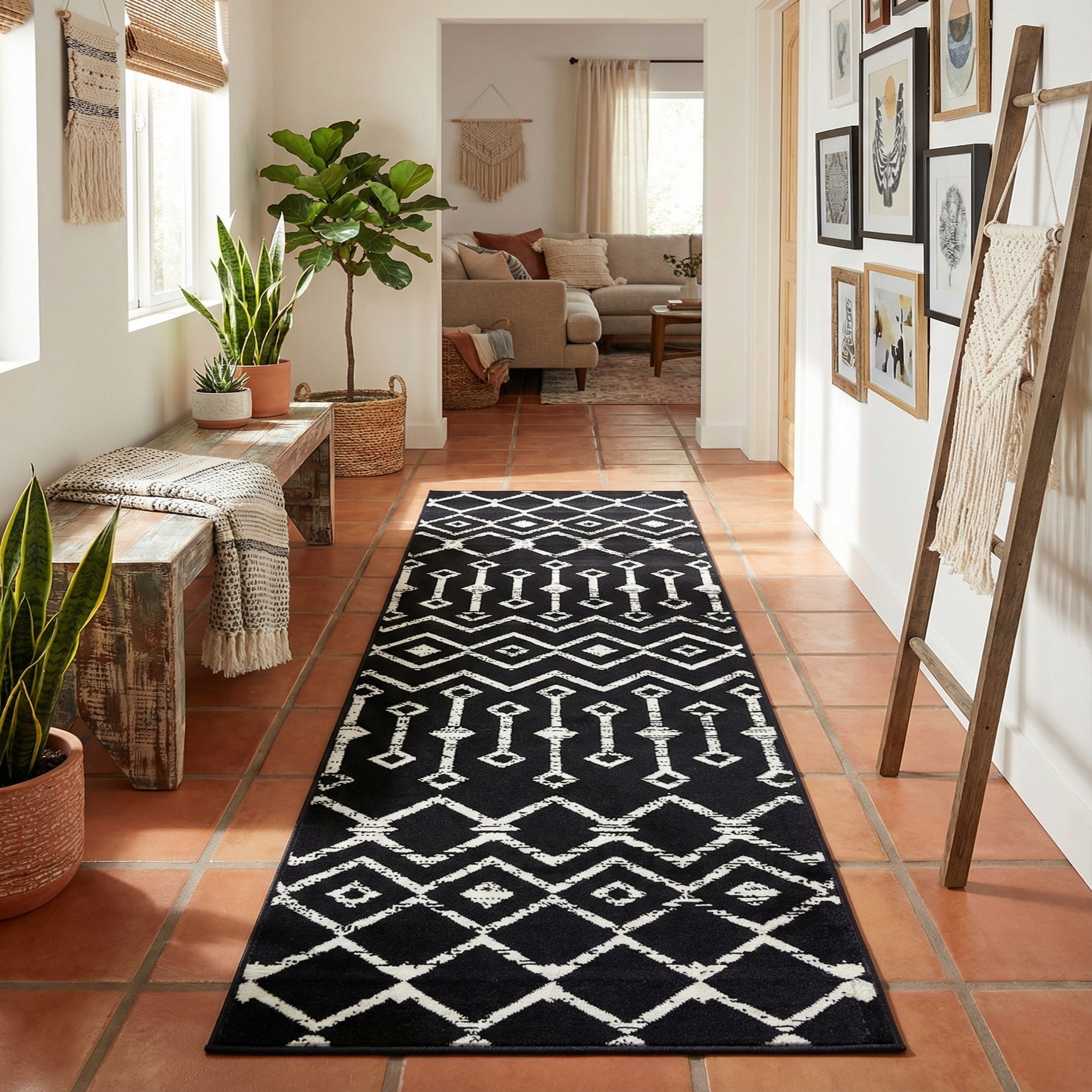 This graphic, monochrome look works well in narrow, high-traffic areas like hallways and entryways, and it can also anchor a contemporary kitchen runner or home office. Pair it with warm wood floors and matte black metal accents for an urban loft vibe, use it to add contrast in a minimalist Scandinavian scheme, or layer it with natural textiles and plants for a modern-boho mix.