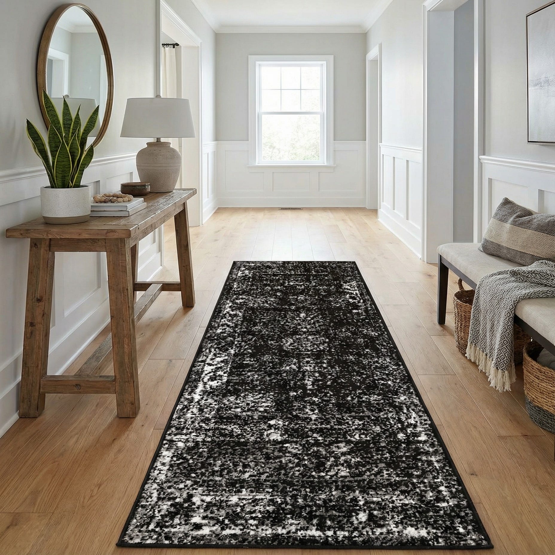 This runner works well in narrow, high-traffic zones where a bold foundation is needed—hallways, entryways, or alongside a kitchen island. It complements contemporary and industrial interiors, anchoring monochrome schemes or balancing warmer wood tones and metallic accents. Layer it under a slim console or use it as a bedroom bedside runner to add graphic contrast without overpowering existing decor.