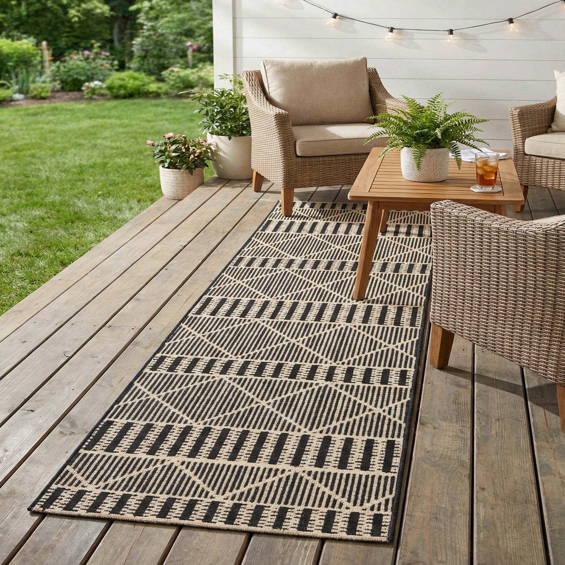 With its stain-resistant property, this runner is a practical choice for outdoor settings, such as patios, decks, or poolside areas, as well as for interior spaces that demand resilience, like kitchens, hallways, or entryways. The bold, eye-catching design works well with contemporary décor themes, complements minimalistic aesthetics, and can serve as a focal point in understated room settings. Consider positioning this runner in settings that feature clean lines and a monochromatic color scheme to underscore its impactful visual appeal.