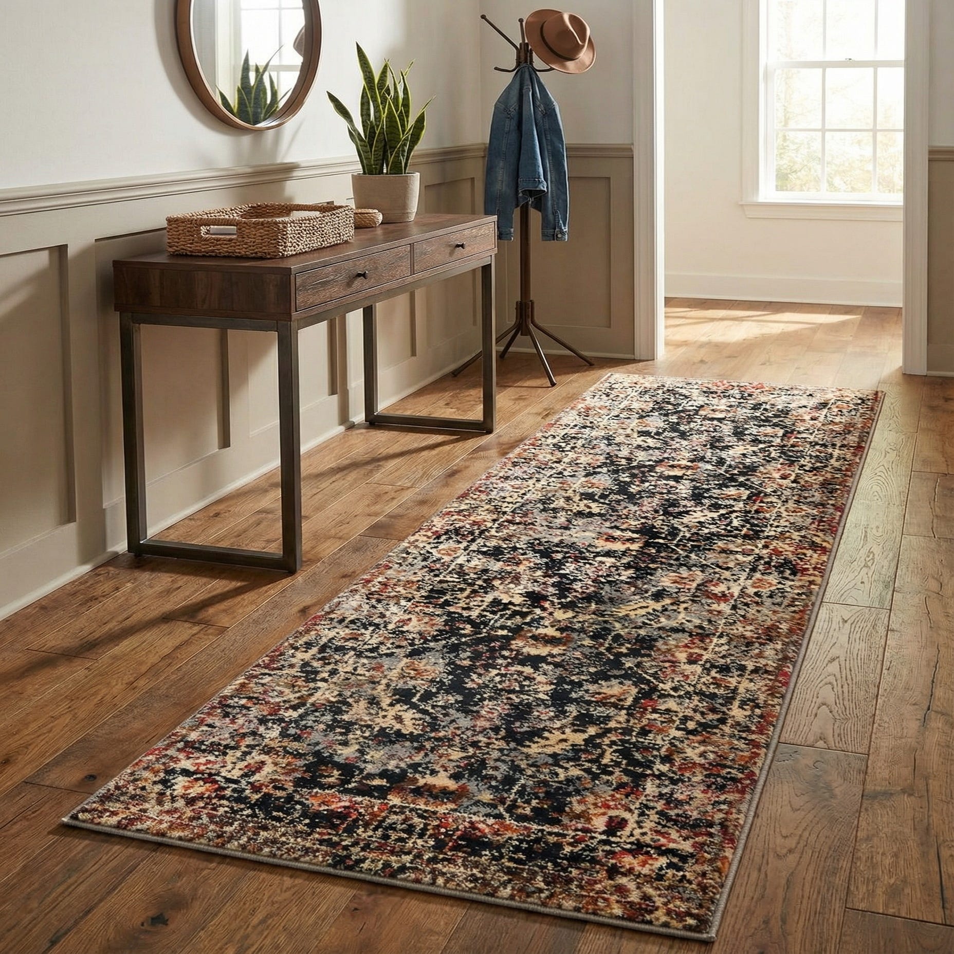 Place this runner in a hallway or entry to anchor narrow circulation areas and add warmth to transitional spaces. It pairs especially well with warm wood floors, leather seating, charcoal or cream upholstery, and metal accents for a layered look that bridges classic and contemporary interiors. The color palette also complements vintage furnishings or a modern industrial scheme, making it an adaptable choice for both traditional and eclectic decor.
