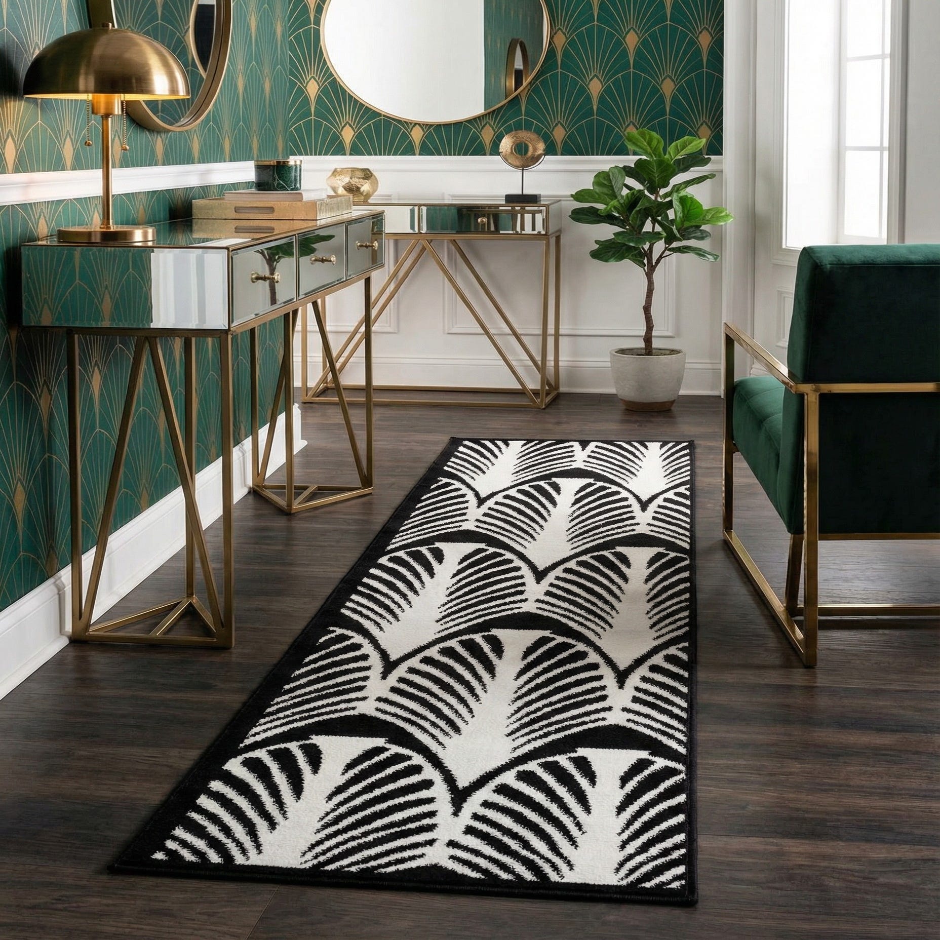 A bold, graphic pattern of repeating fan-shaped arches in ivory sits crisply against a deep black background, creating a rhythmic, Art Deco–inspired look. The arches are formed from finely spaced radiating lines that produce a dynamic sense of movement across the runner, while the high-contrast palette keeps the design contemporary and versatile. Machine-made in 100% polypropylene, the construction delivers sharp pattern definition and consistent color contrast.