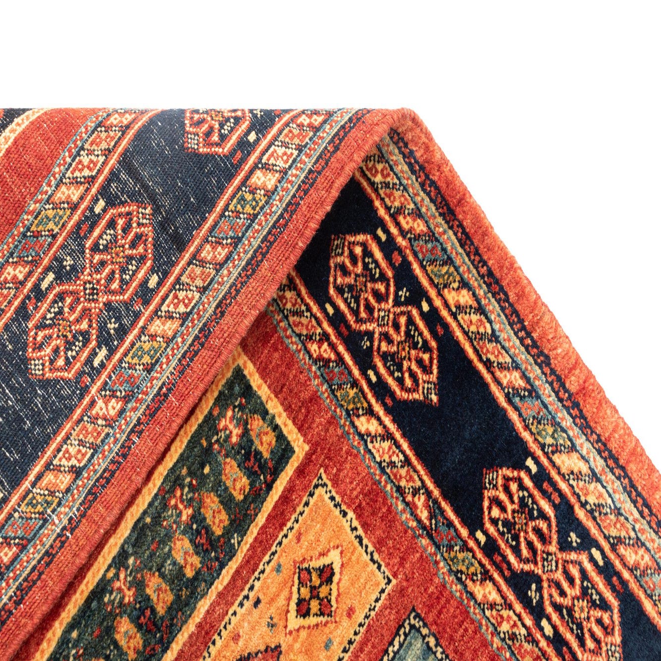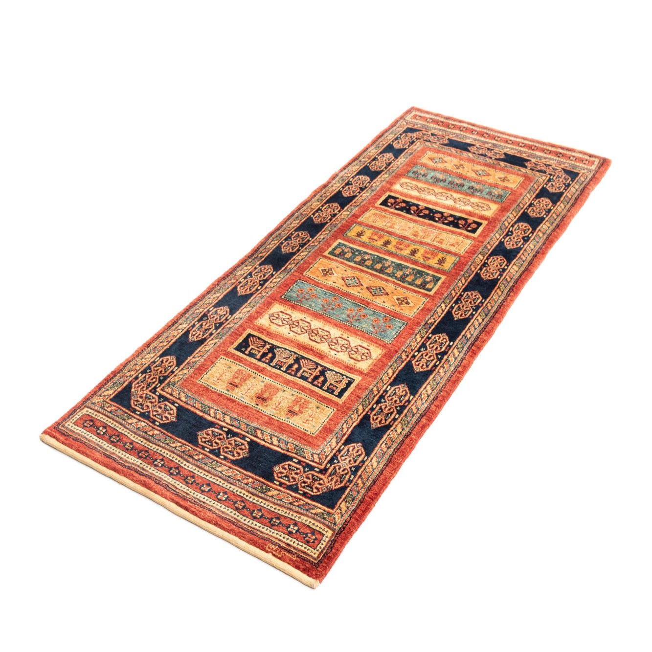 Hand made of 100% wool, this runner is organized into stacked rectangular panels framed by a strong black border and deep navy guard. Each band carries a different motif—geometric diamonds, linked medallions, tiny stylized animals and simple floral rows—rendered in red, dark blue, brown, yellow, orange, green and blue. The black background and navy edges ground the design while the warm rust and golden panels add warmth and visual rhythm; the wool pile feels dense and slightly plush underfoot, with a clear hand-made texture that gives each motif subtle depth.