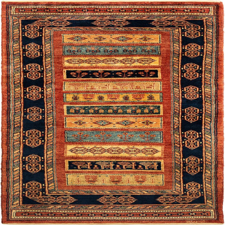 Primary color is Black. Colors in this rug include: Black, Red, Dark Blue, Brown, Yellow, Orange, Green, Blue.