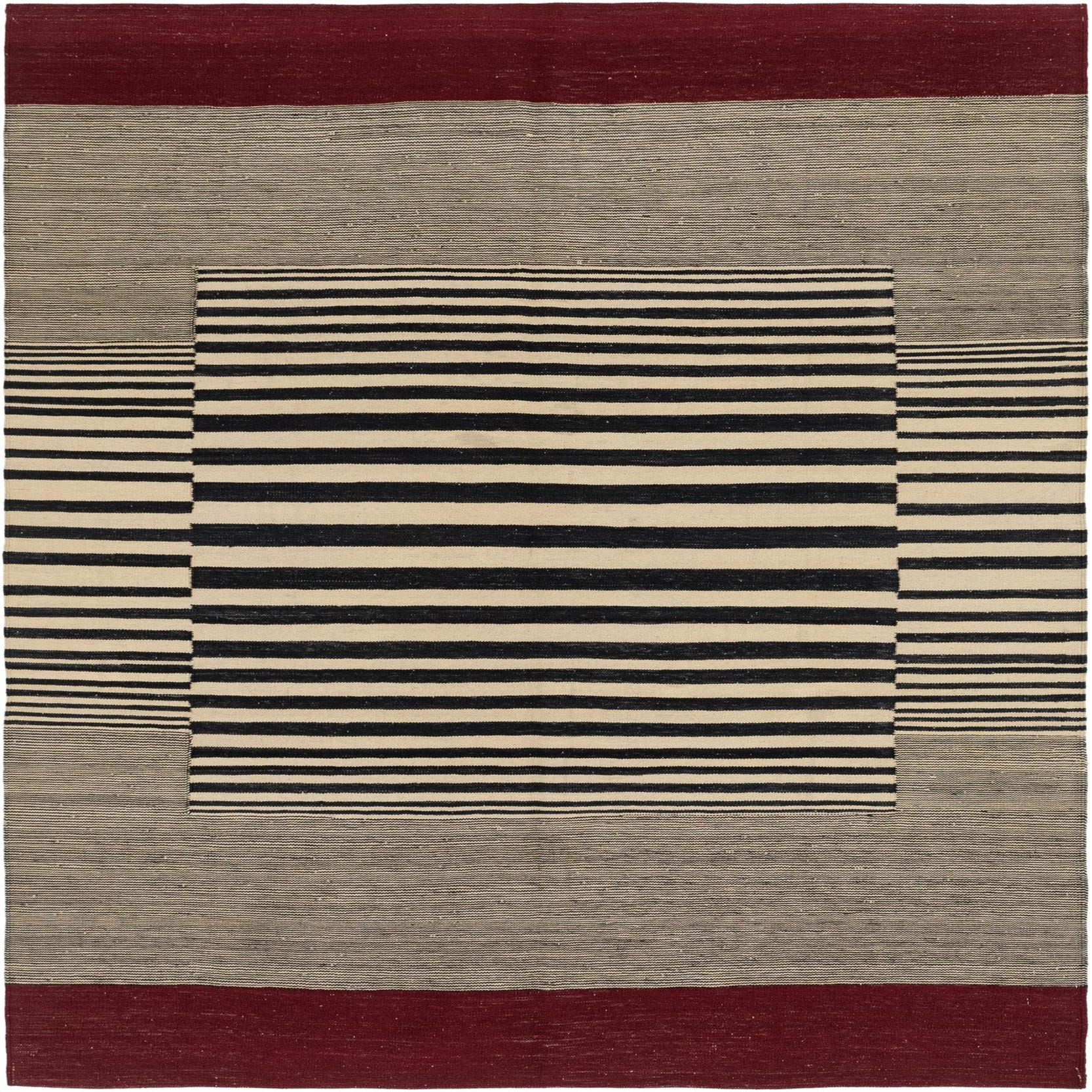 A 6' 4 x 7' 7 square Kilim Modern wool rug featuring a bold black and cream striped center, framed by light gray and deep red borders.