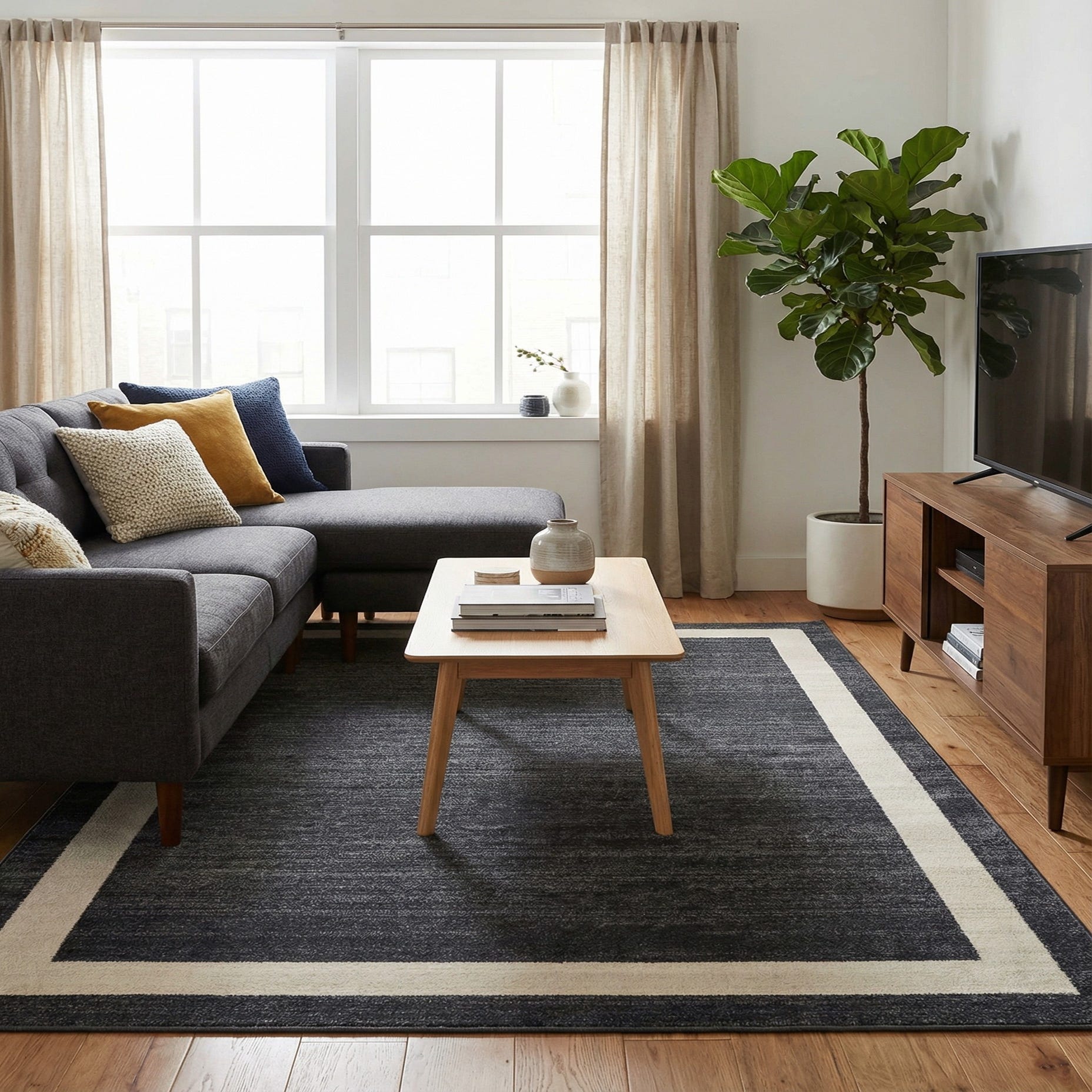 A strong black field anchors this rug, punctuated by a clean ivory inner border that creates a refined, framed look. The surface shows a subtle, tonal striation across the black background, giving the piece a soft, woven appearance while keeping the overall design minimal and modern. Run your hand over the low, machine-made pile and you’ll notice a smooth, slightly dense texture—comfortable underfoot with a neat, tailored finish.