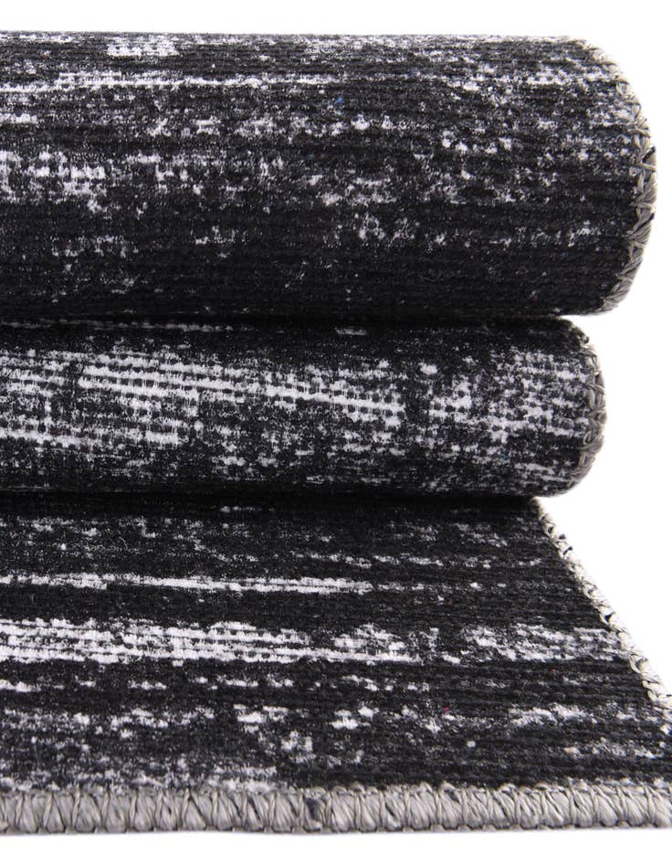 A 7x10 rectangular black modern area rug with a textured, distressed stripe pattern, suitable for a living room or office.