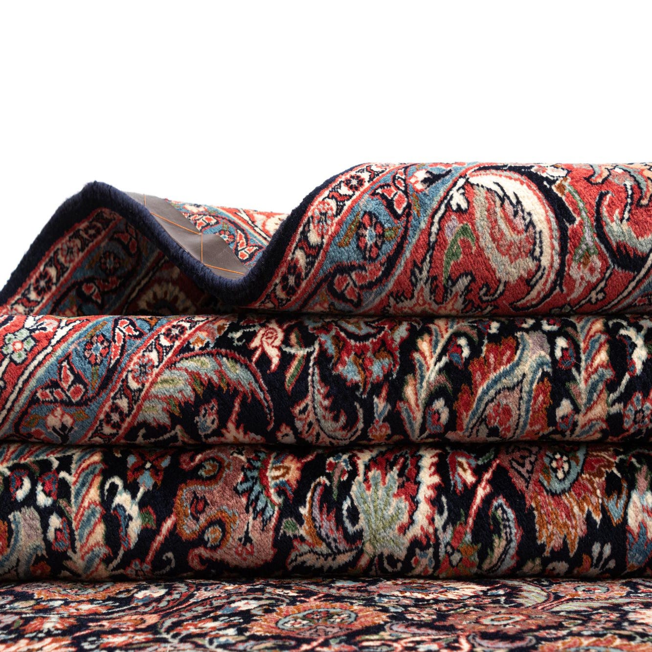Hand-made from 100% wool, this rug presents a traditional all-over Persian garden pattern on a deep black field. Repeating floral and palmette motifs are worked in rich red with accents of blue and green, and a wide red border with scrolling vines frames the central design. The hand-knotting produces a dense, low pile with a firm, slightly springy hand; the wool has a natural luster and a warm, tactile surface that holds the intricate pattern clearly.