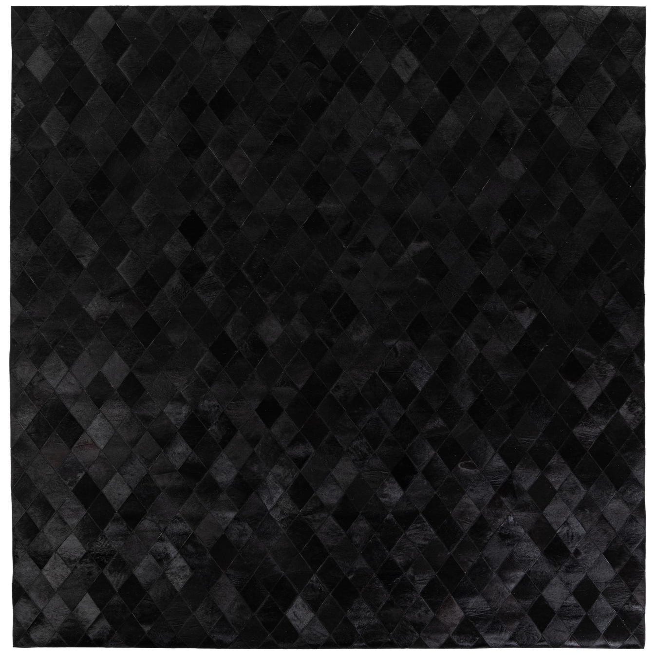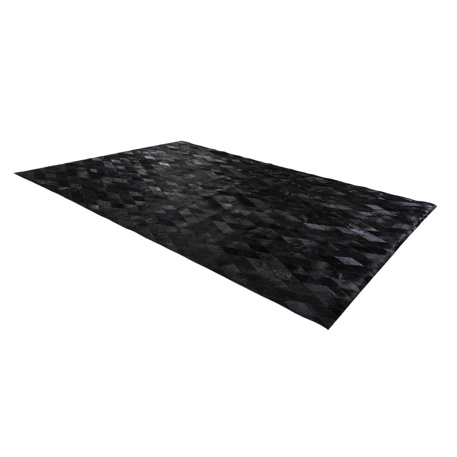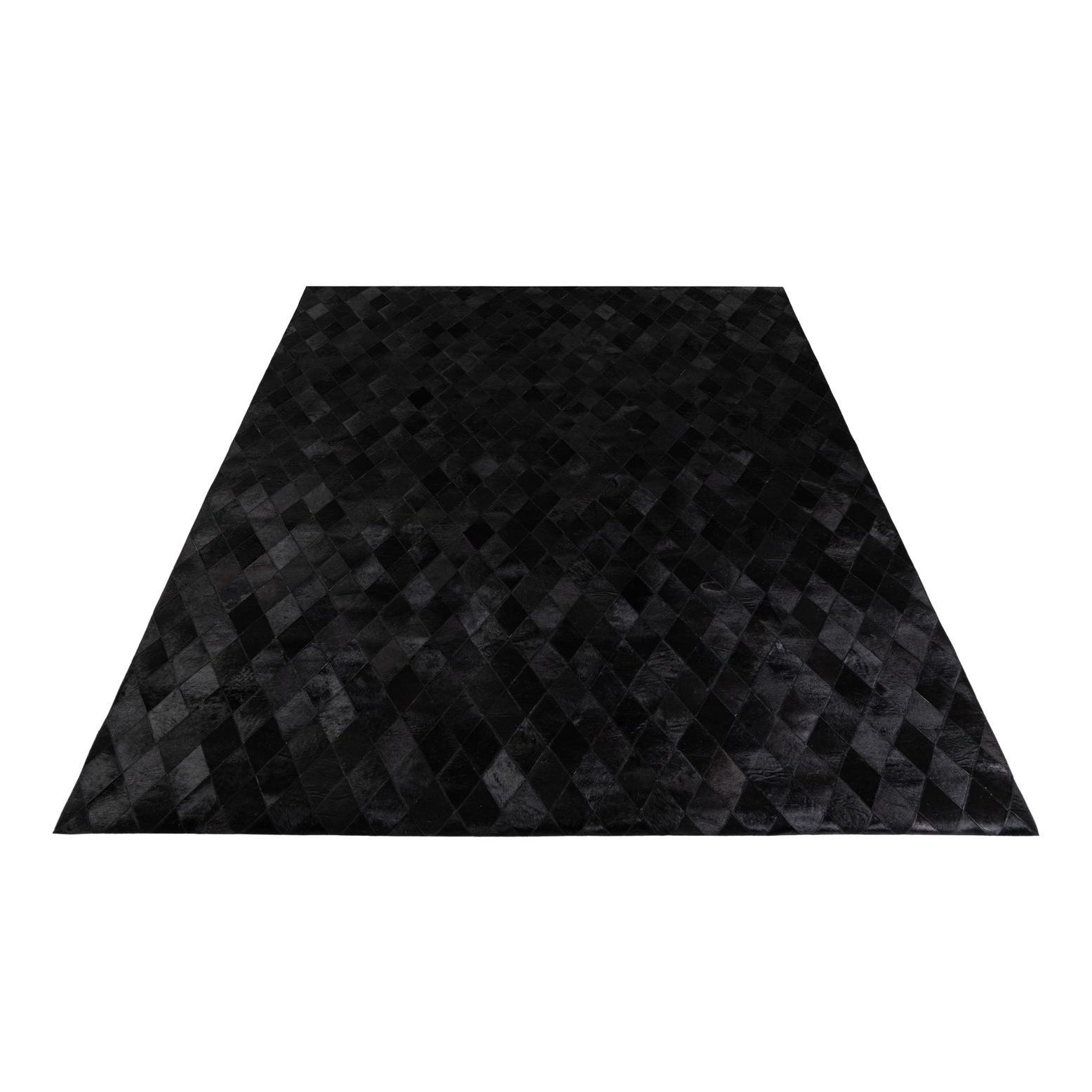 A 7x10 rectangular black modern cowhide rug with a subtle diamond pattern, suitable for a living room.