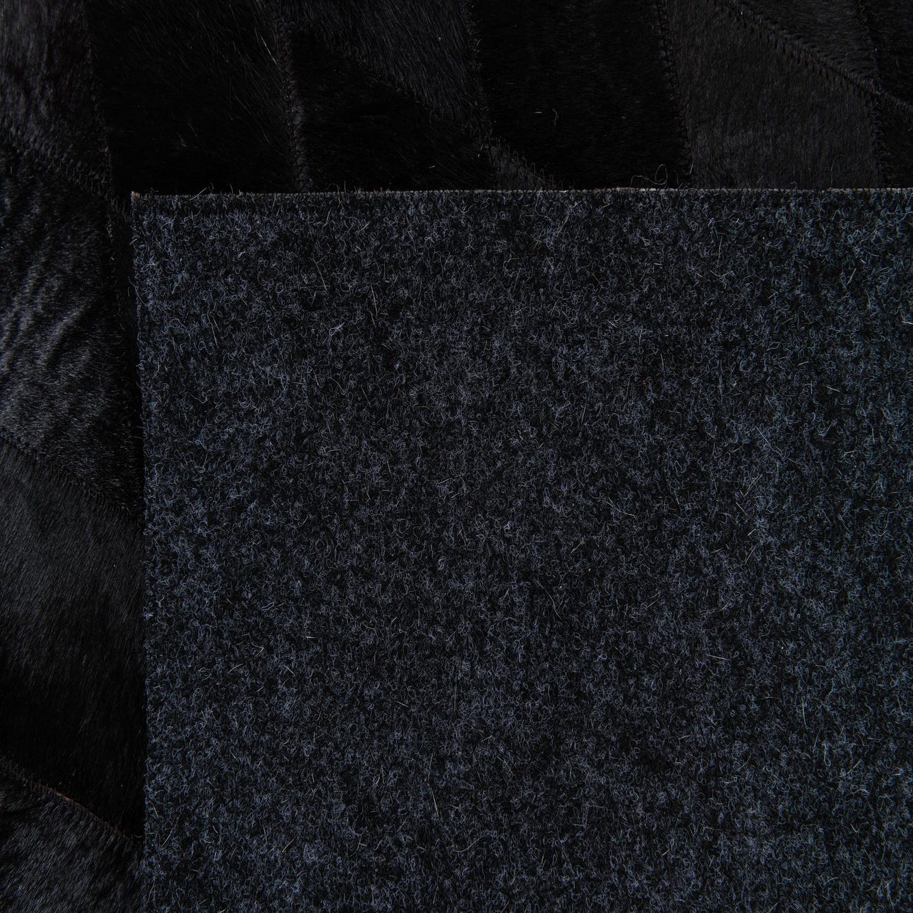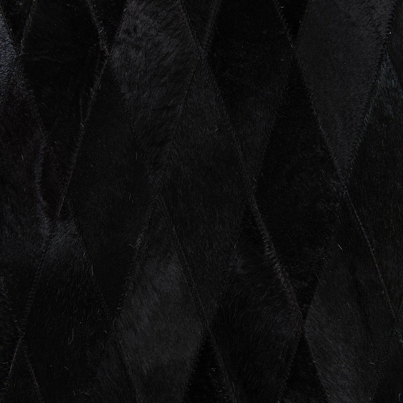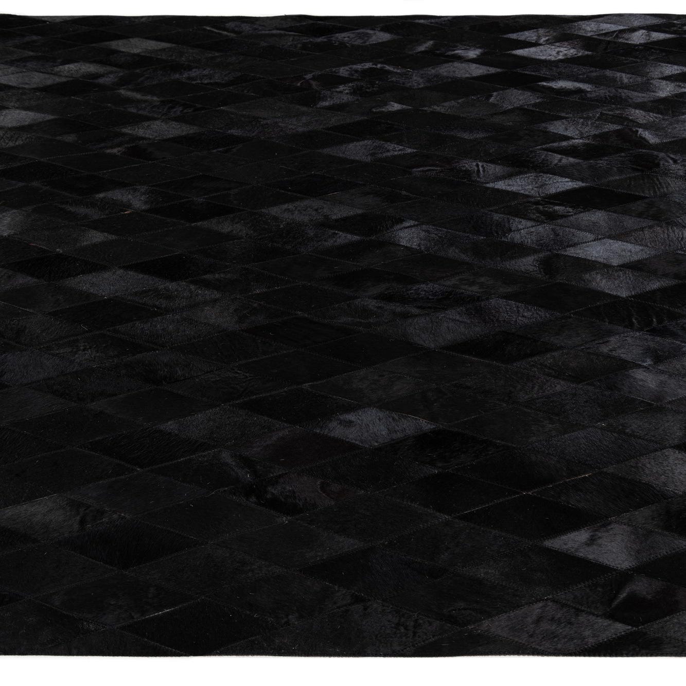 A 7x10 rectangular black modern cowhide rug with a subtle diamond pattern, suitable for a living room.