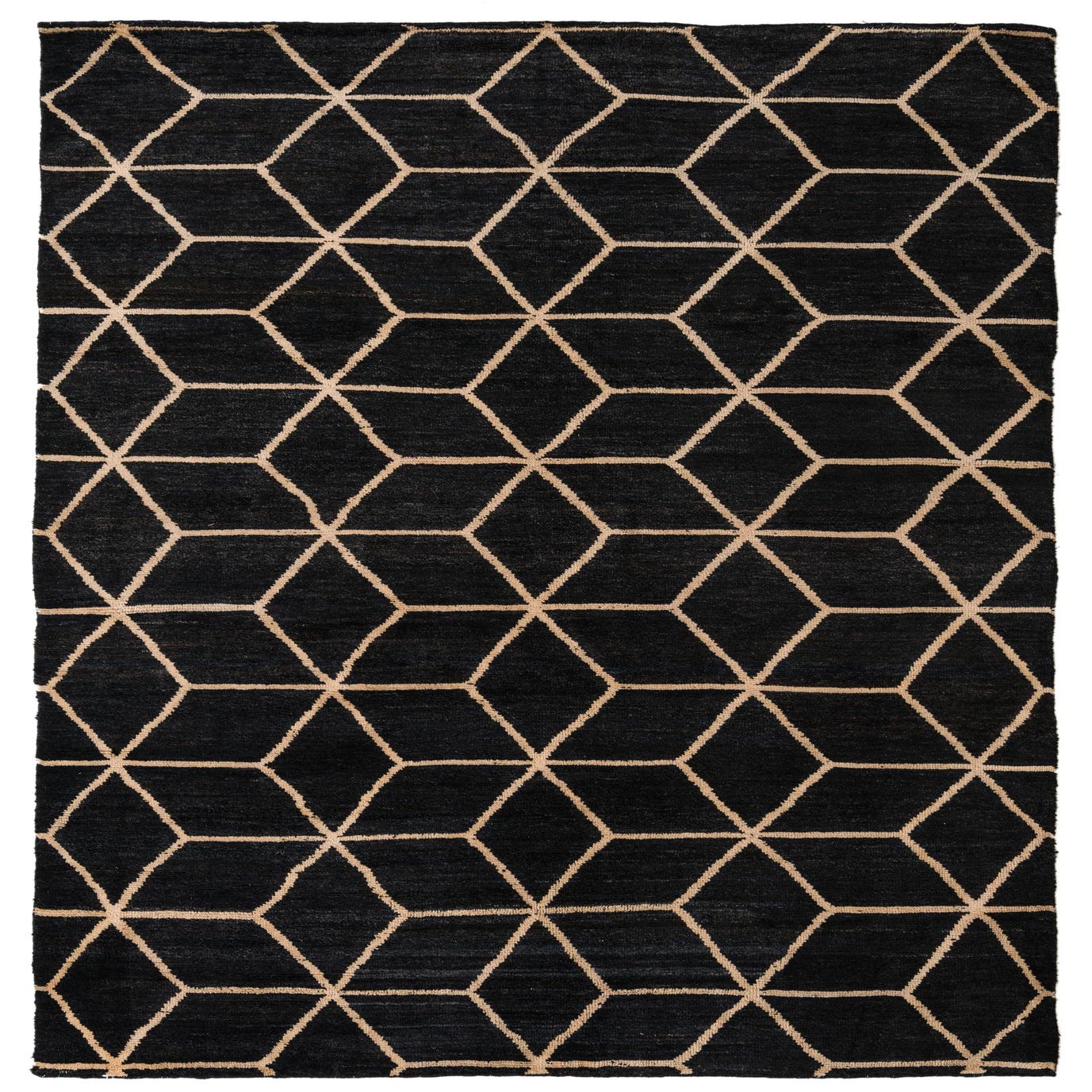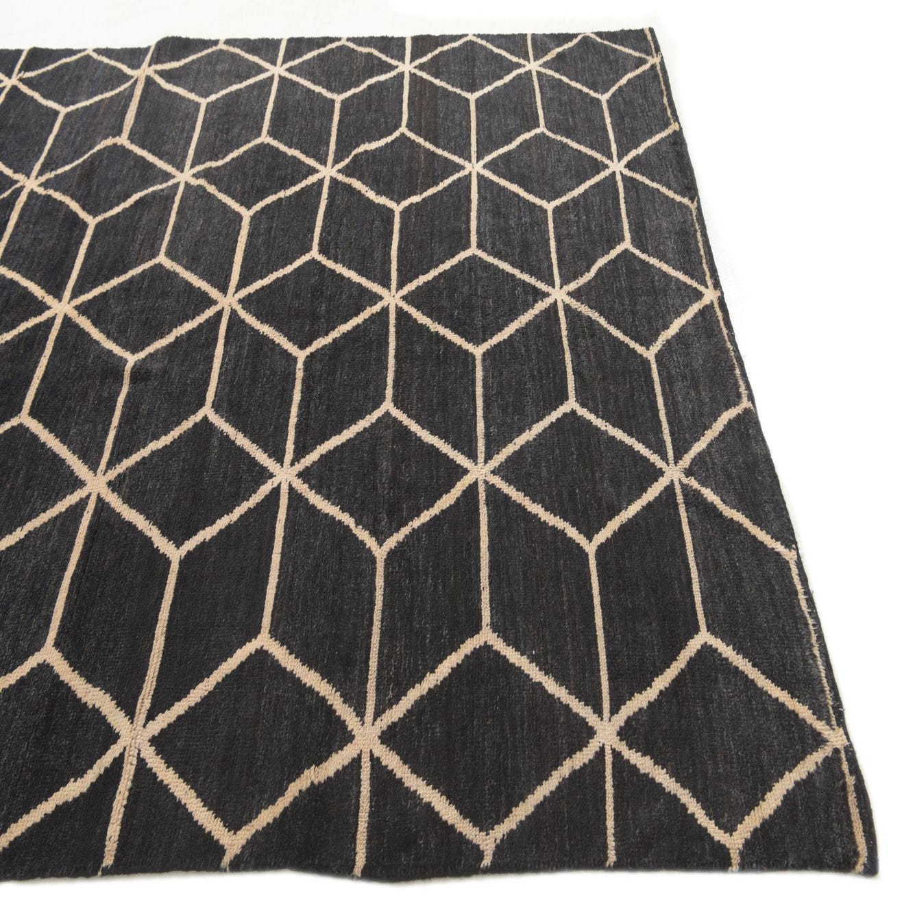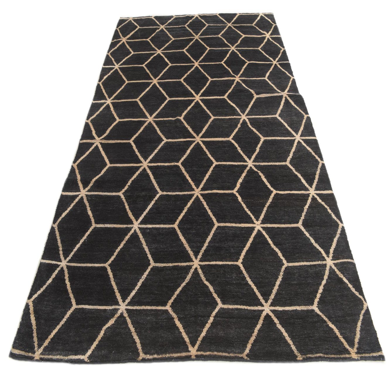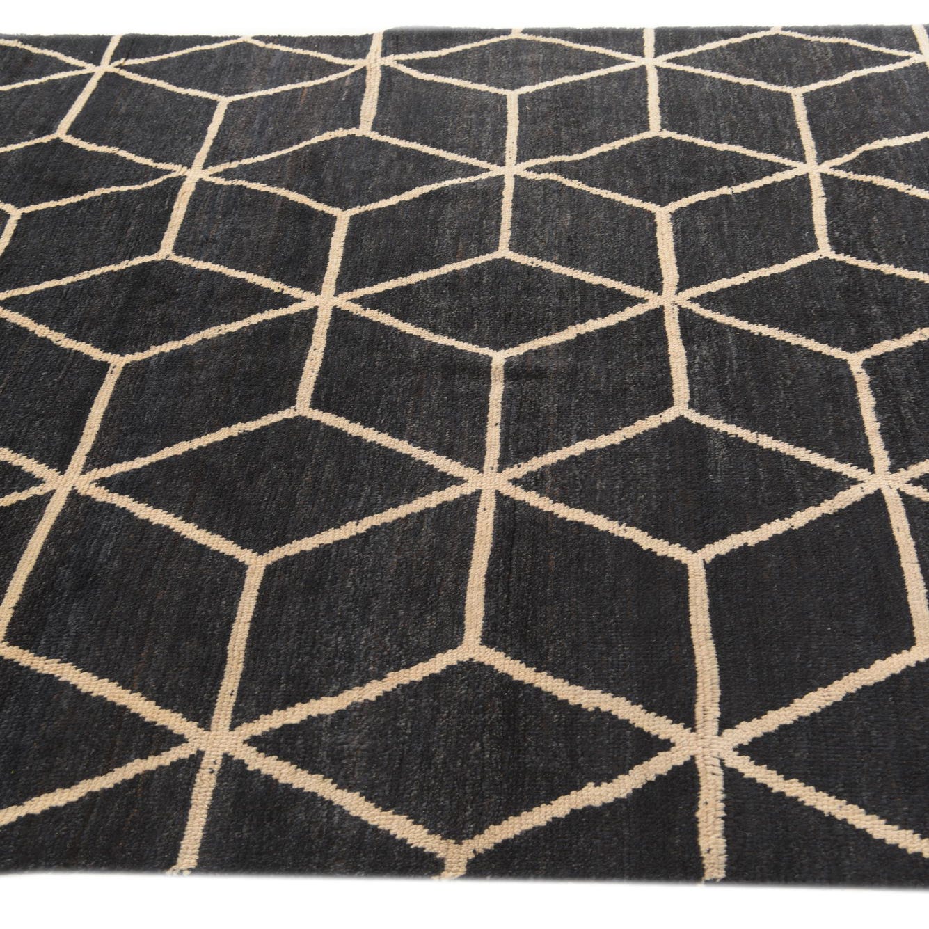 A 7x10 rectangular black wool rug with a repeating modern abstract geometric pattern of light beige interconnected cubes.
