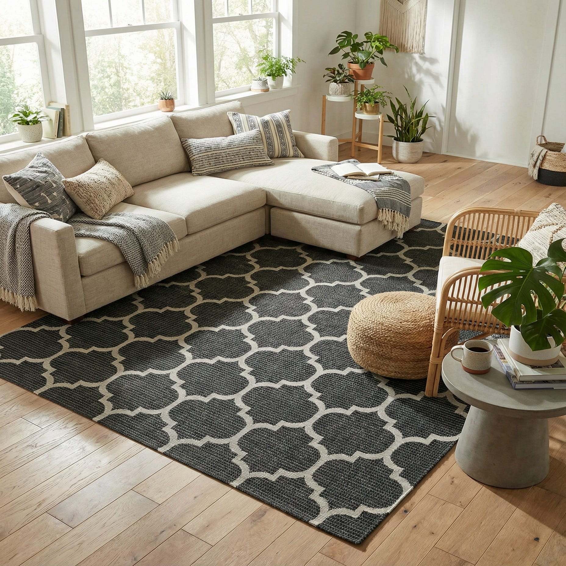 Place it to anchor a living room seating group or beneath a dining table to define the space without adding height. It complements modern, transitional, or monochrome interiors—try it with light wood furniture and matte metal accents for contrast, or layer it with textured throws and patterned pillows to soften a minimalist scheme. Its bold pattern also works well in an entryway or home office where you want a strong graphic element.