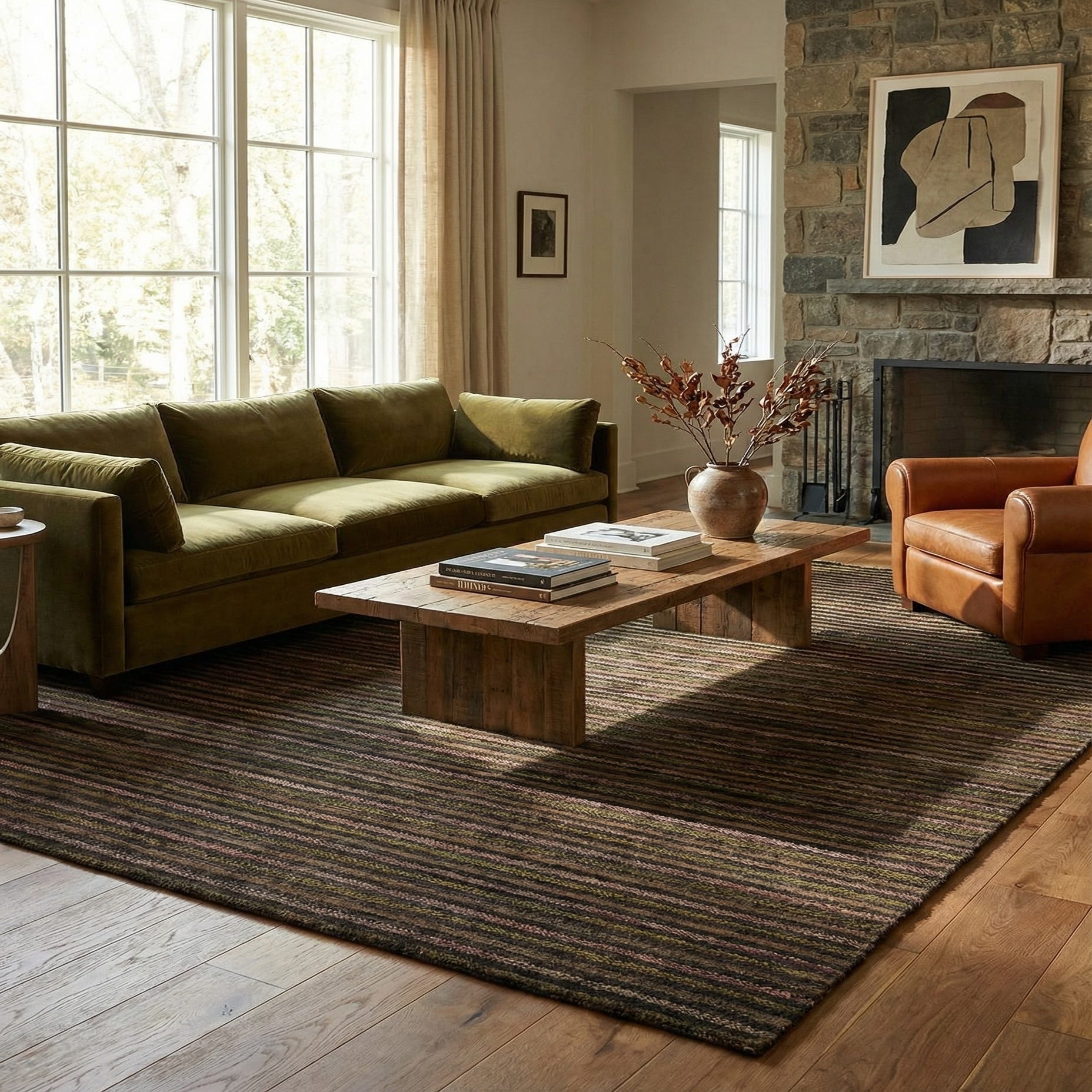 A 7x10 rectangular Juma Persian rug in black with subtle horizontal stripes of brown, green, and pink.