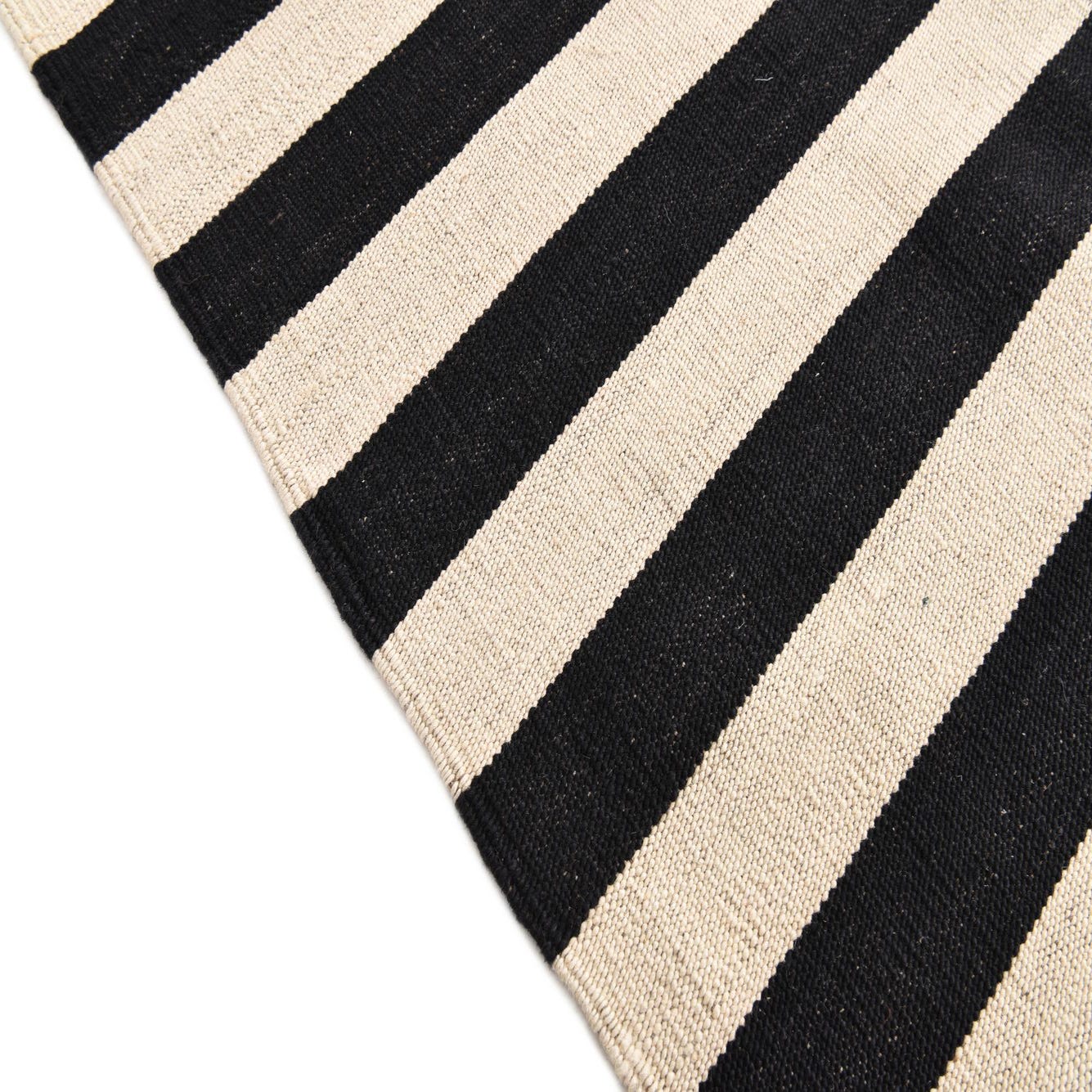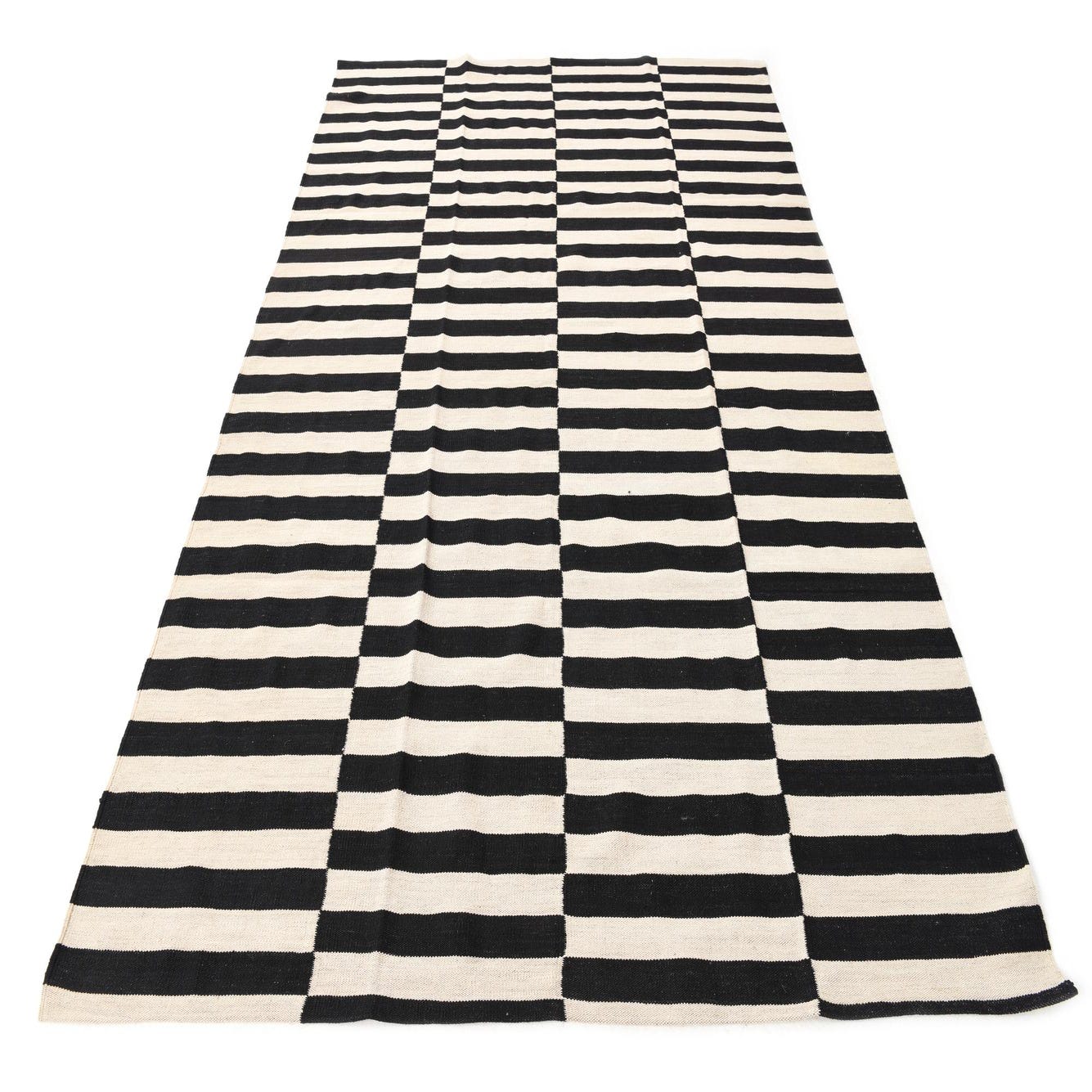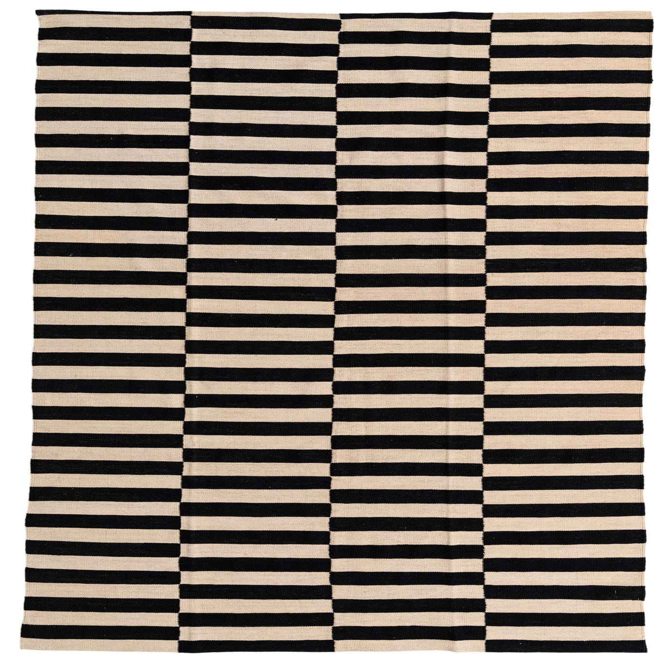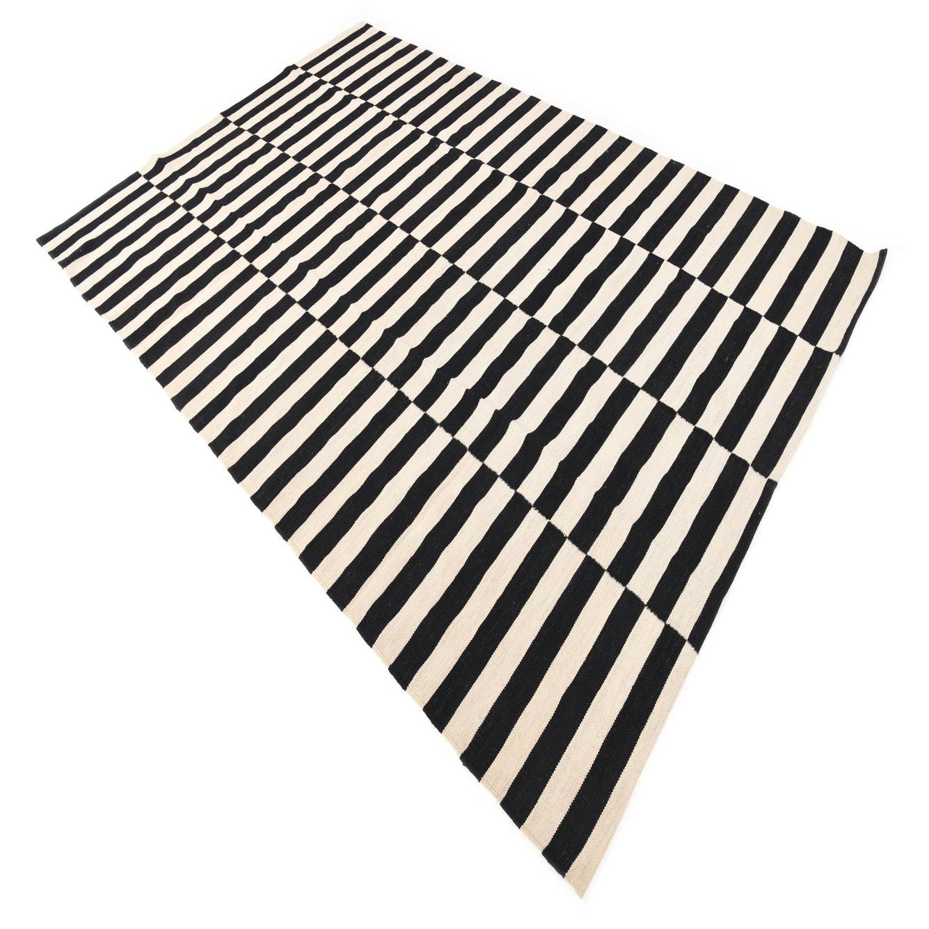A 7x10 rectangular flatweave rug with alternating horizontal black and cream stripes in a modern tribal pattern.