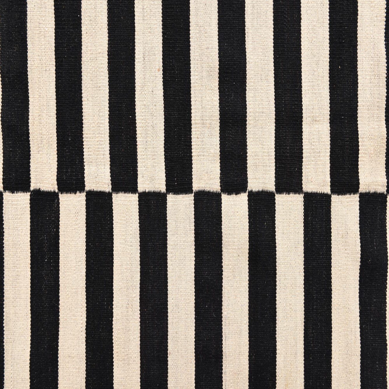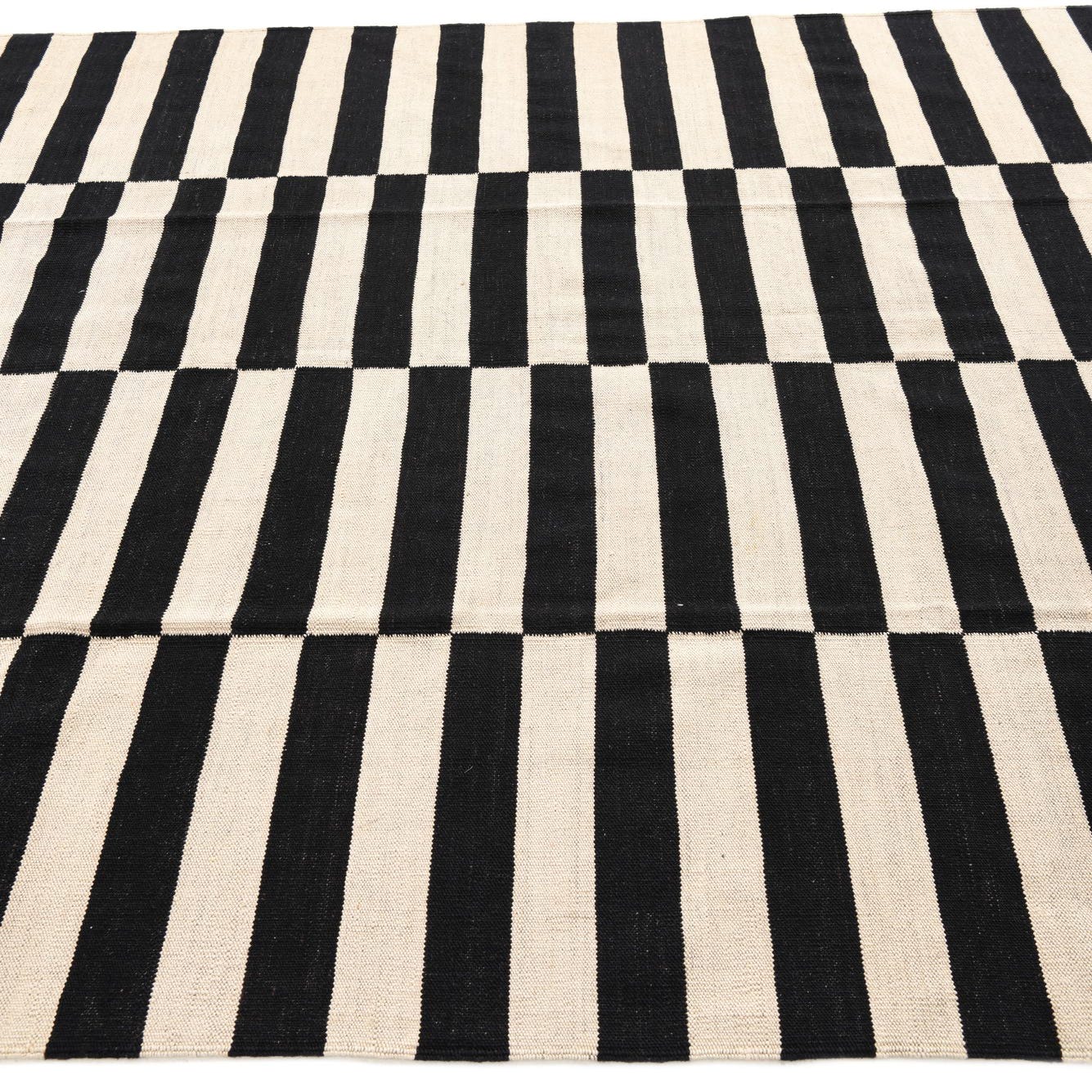 The simple yet striking pattern of this rug allows it to stand out in a minimalist interior, complementing sleek furniture and monochromatic color schemes. It could also serve as a grounding element in a more eclectic or bohemian space, where its neutral tones can balance out more colorful or patterned textiles. The flatweave construction is conducive to high-traffic areas such as living rooms or offices, while the woolen material adds a touch of warmth to bedrooms or cozy seating areas.