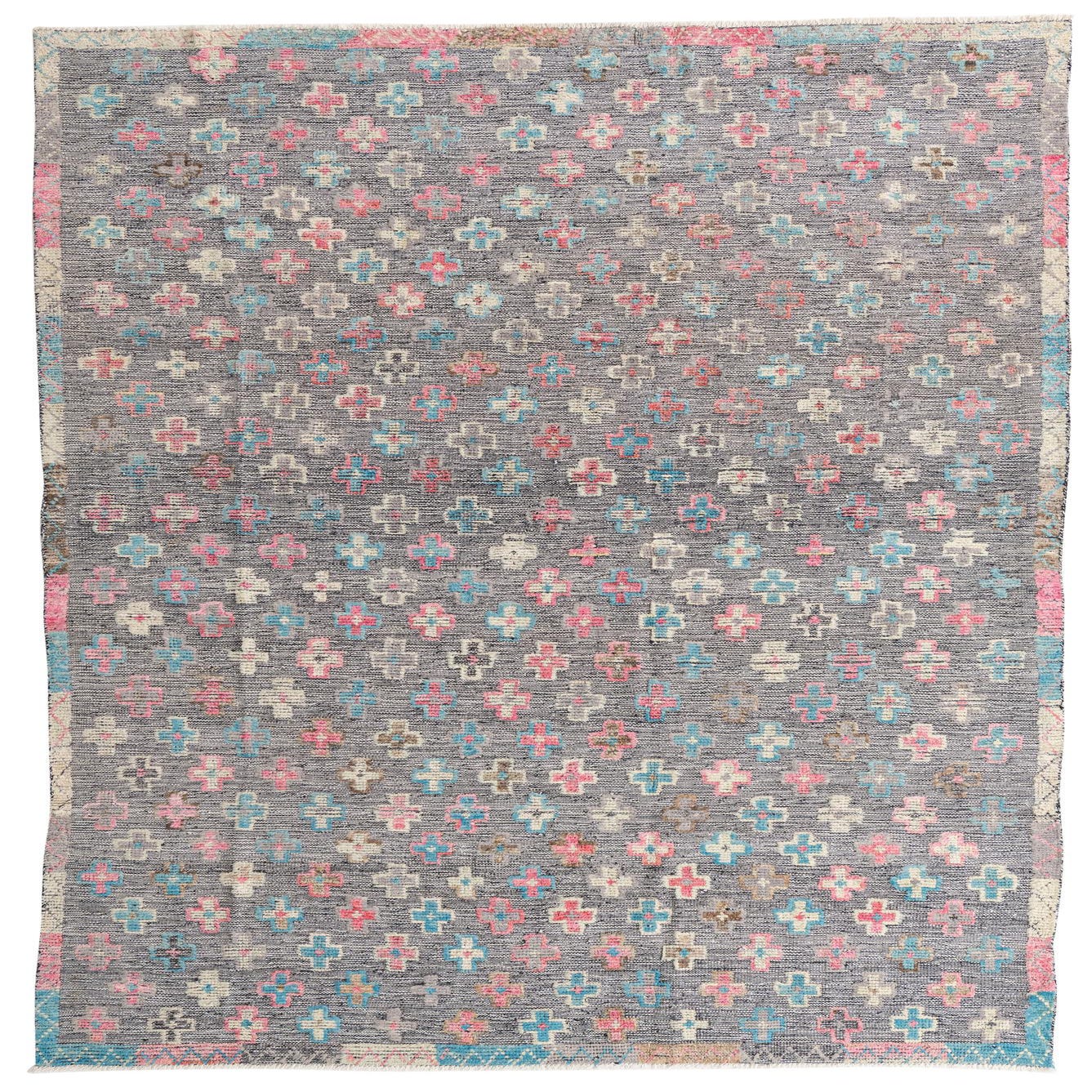 A 7x10 rectangular black wool rug with a repeating pattern of small, colorful Southwestern-style crosses in pink, blue, and white.