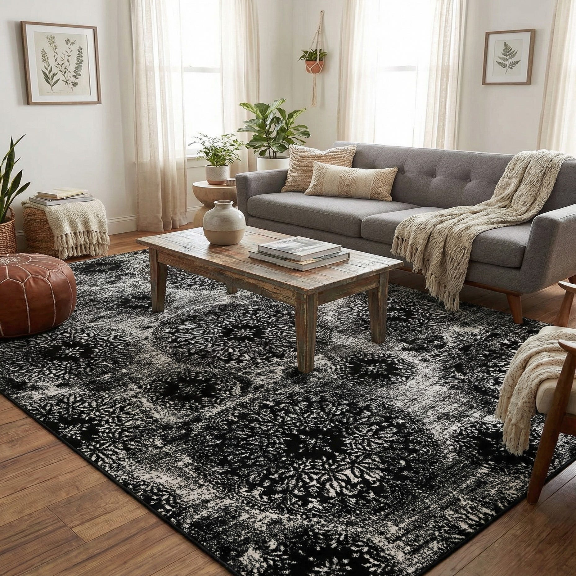 A 7x10 rectangular black and white distressed area rug with large floral medallion patterns, suitable for a living room.