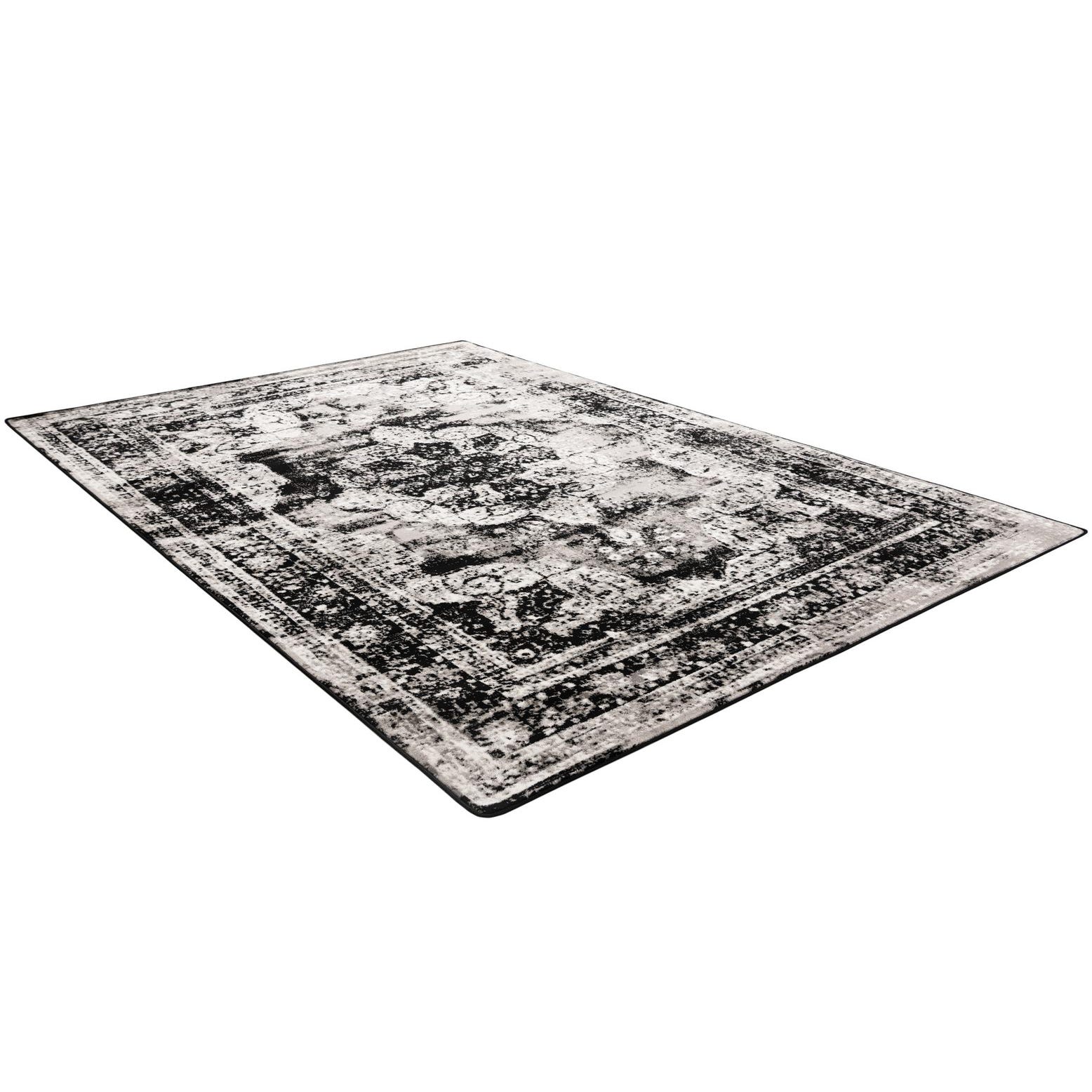 Primary color is Black. Colors in this rug include: Black, Gray, Ivory.