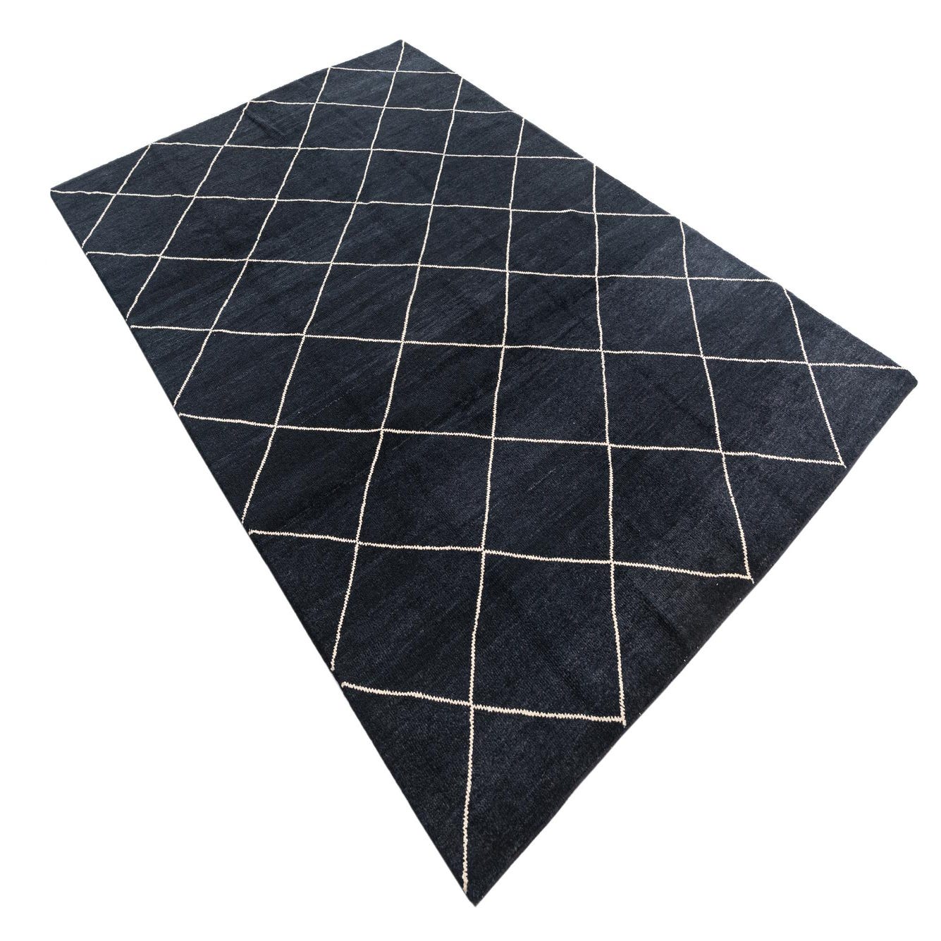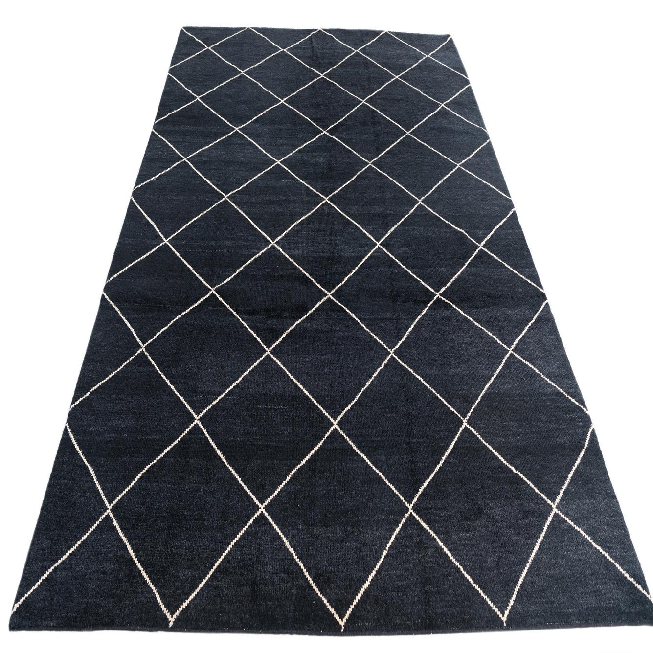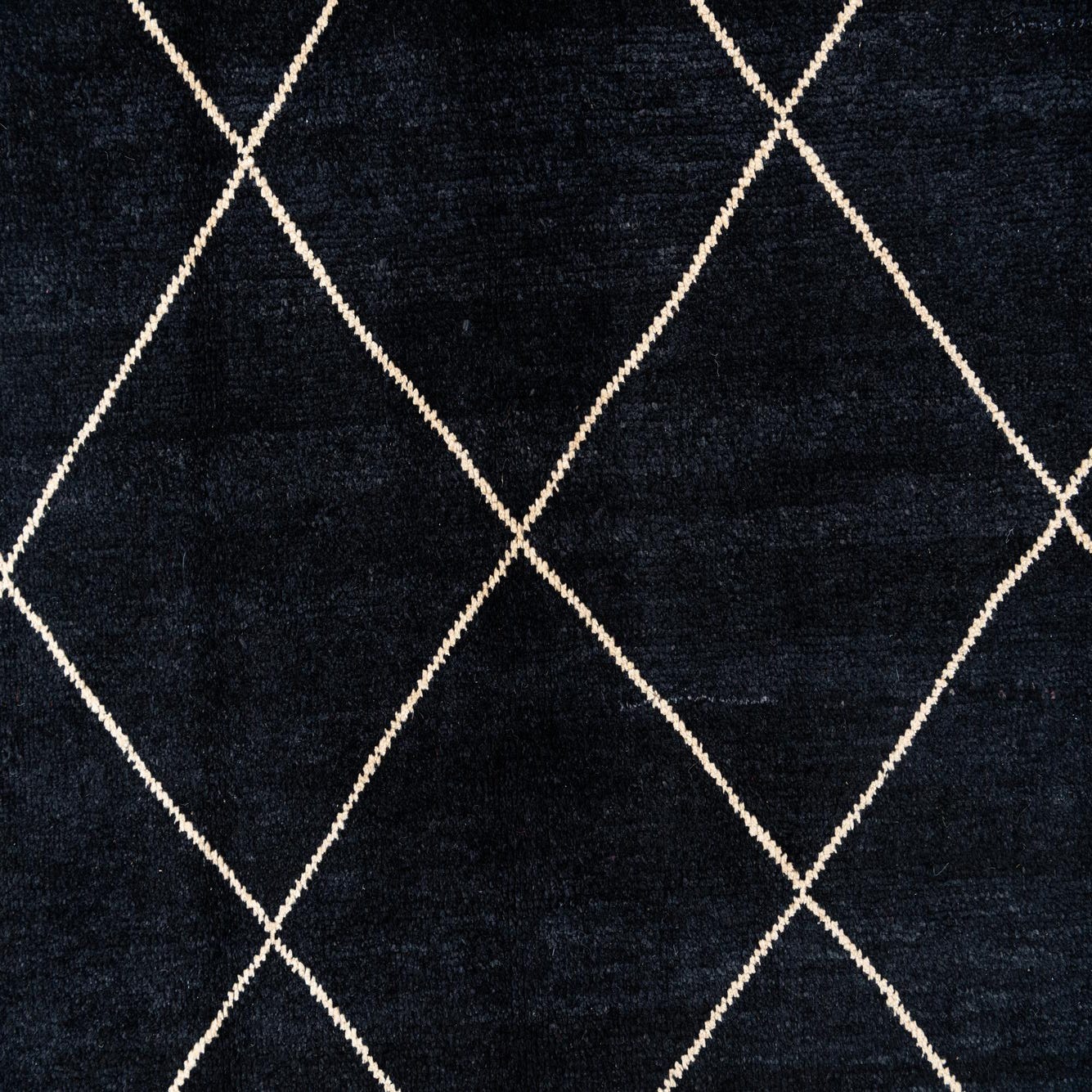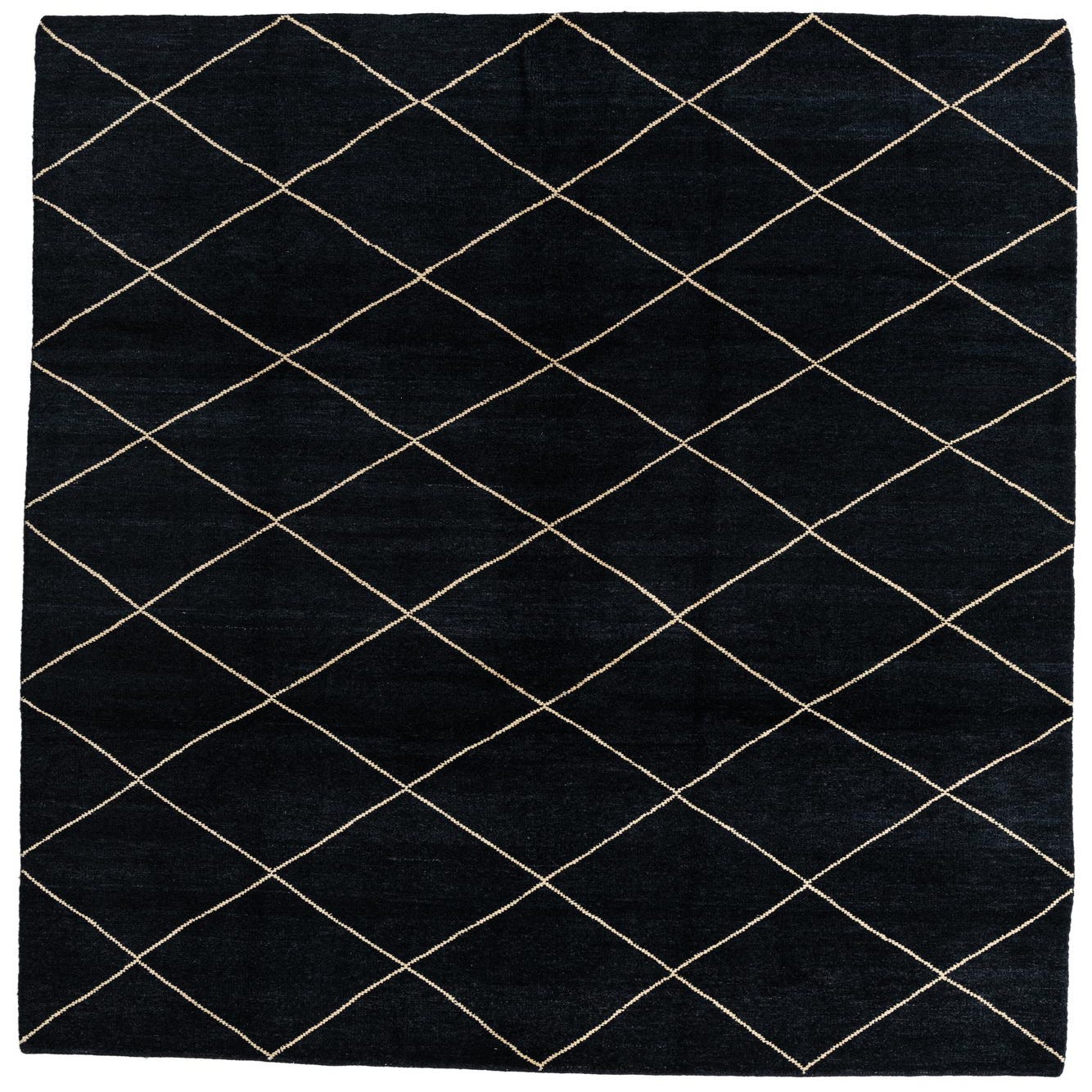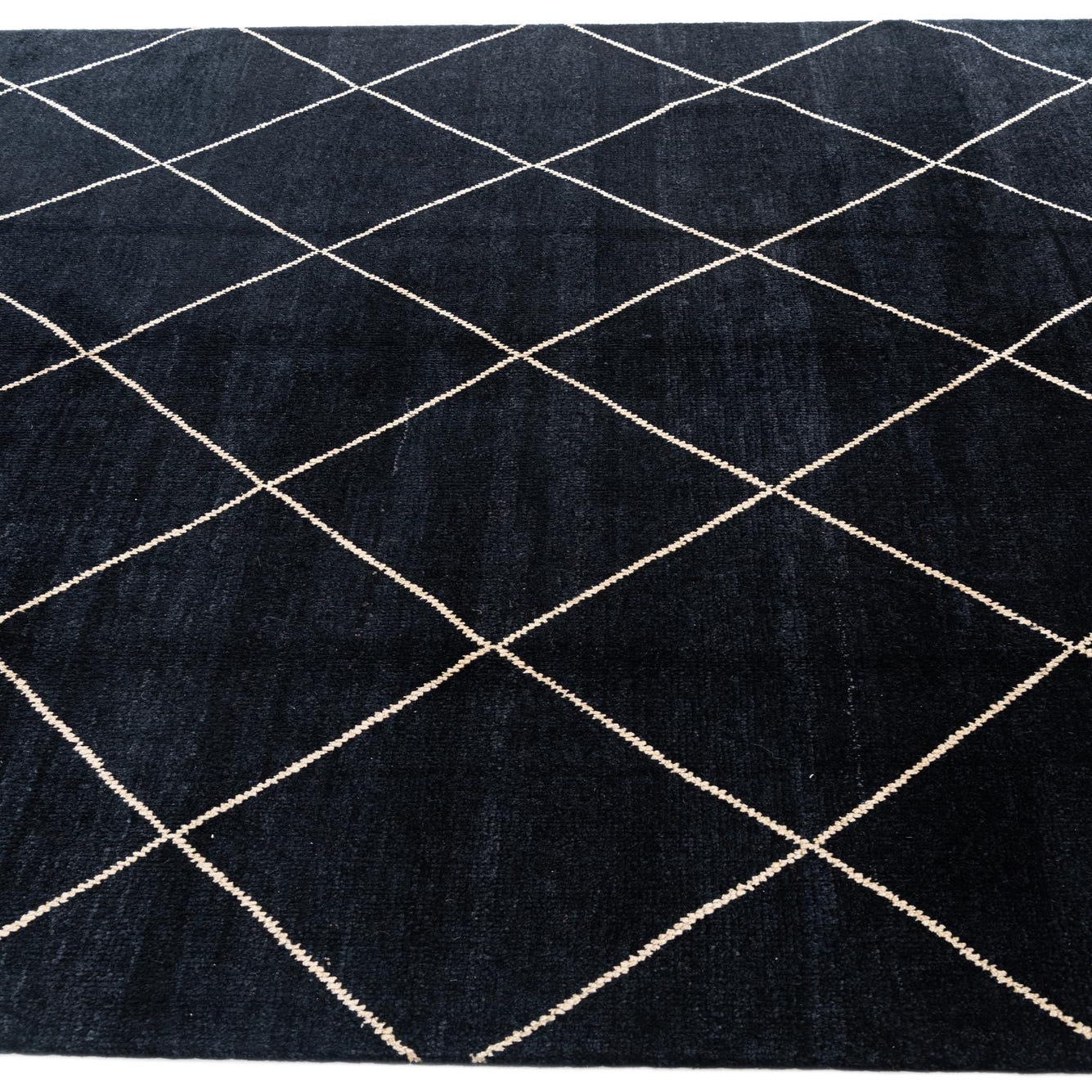 A 7x10 rectangular black shag rug with a cream diamond trellis pattern, ideal for a living room.