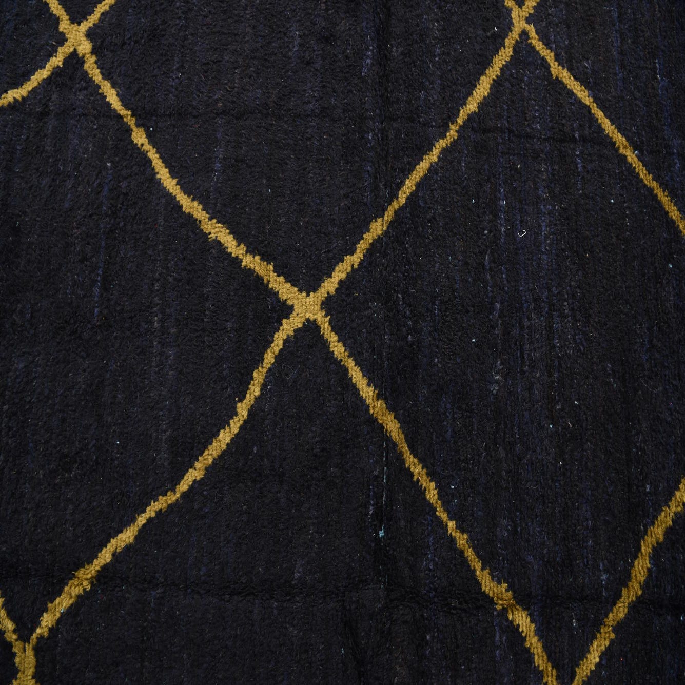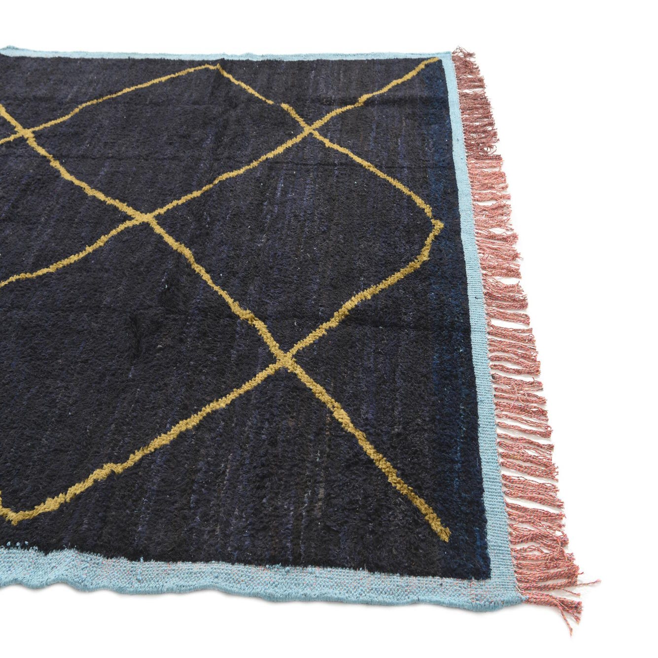 A 7x10 rectangular black shag rug with an irregular gold diamond pattern, light blue border, and terracotta fringe.