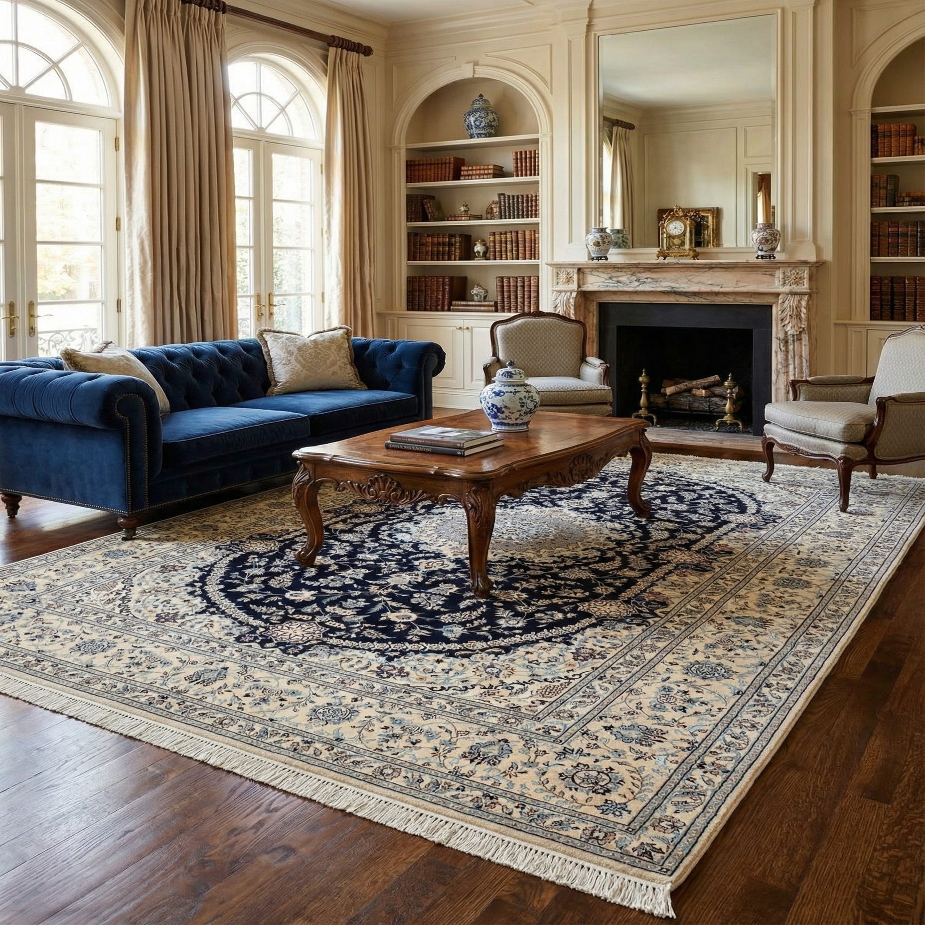 Ideal settings for this piece include formal living rooms, dining rooms, or office spaces where it can serve as a focal point or an anchor for high-end furnishings. The rug's dark tones pair well with a variety of wood finishes and can help to ground a space while adding warmth and sophistication.