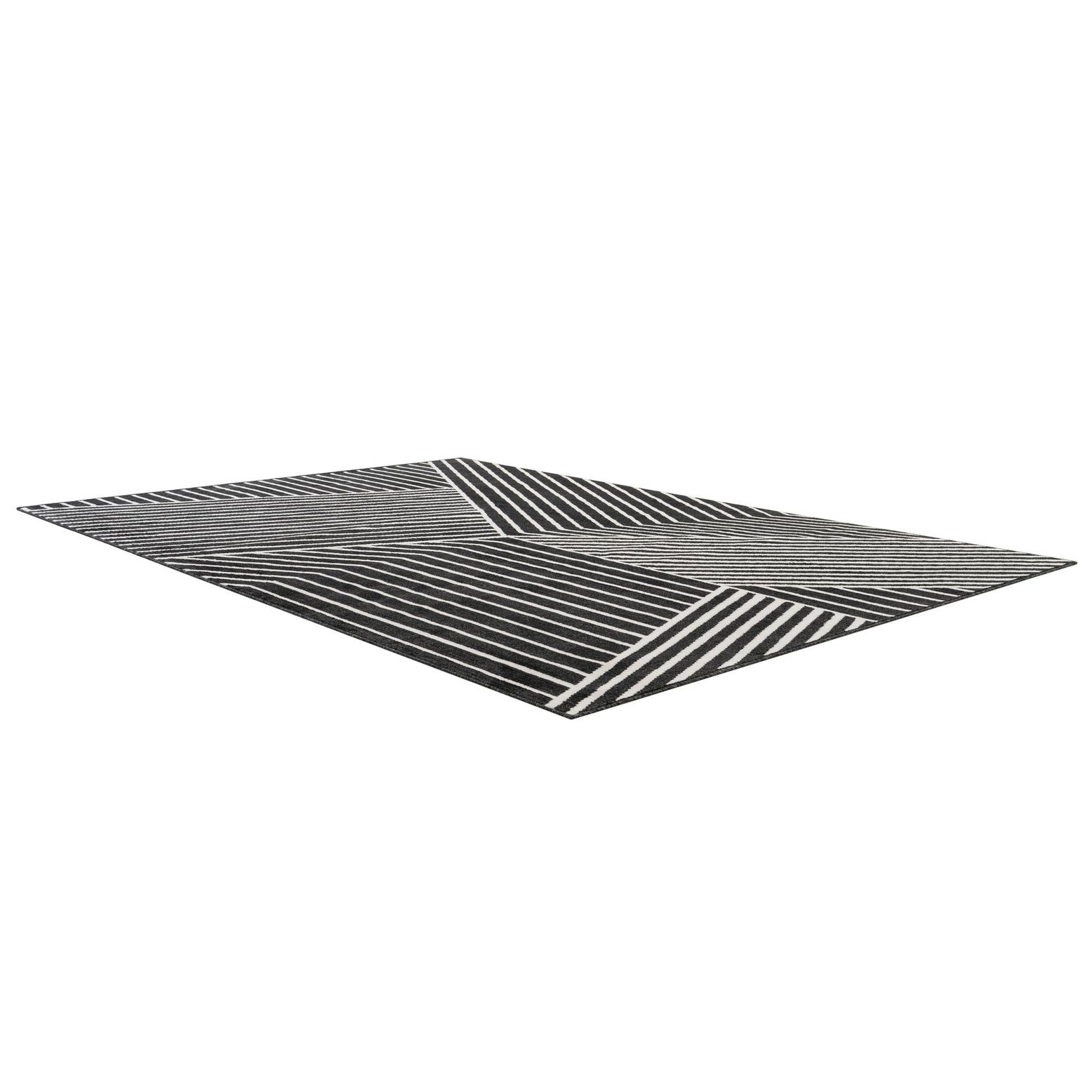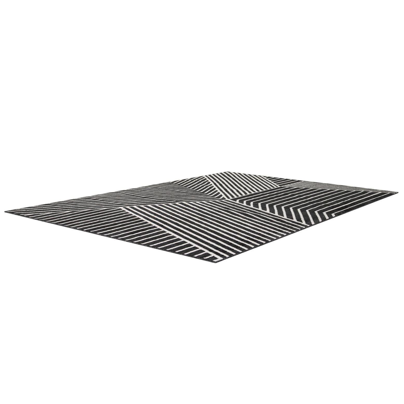 A 7x10 rectangular black and white modern rug with bold geometric stripes in varying directions.