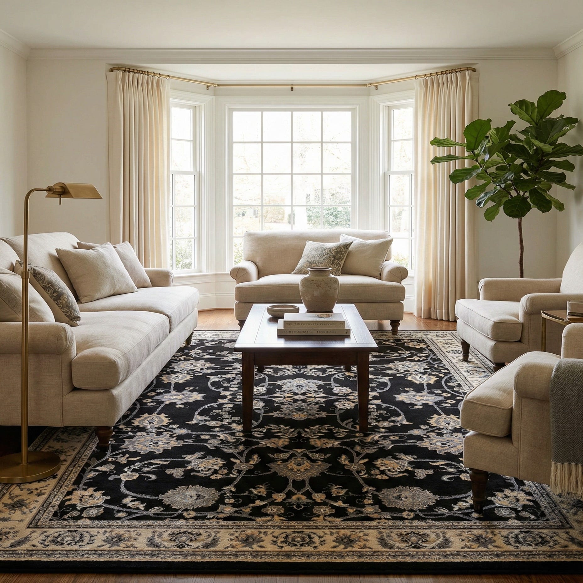 Primary color is Black. Colors in this rug include: Black, Gray, Tan, Ivory.