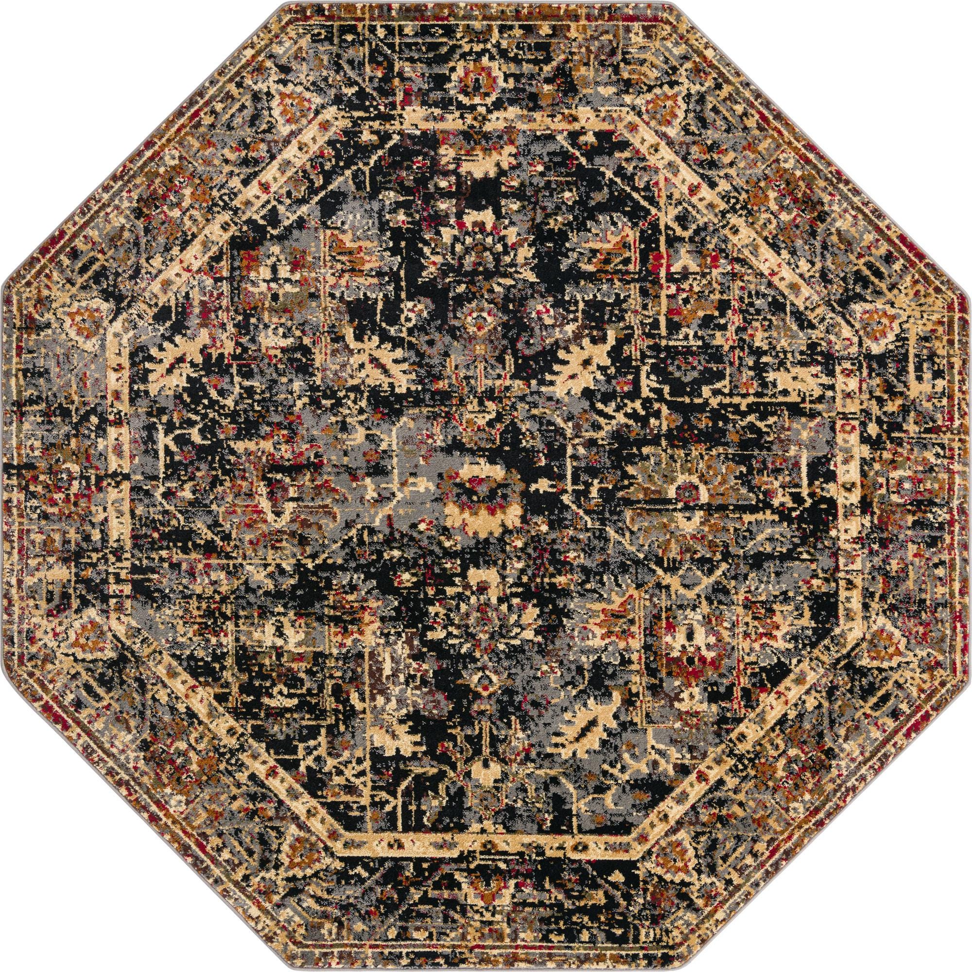 An octagon-shaped Rugs.com Saturn rug, 7'10" x 7'10", featuring a distressed traditional black, grey, and gold pattern with floral and tribal motifs.