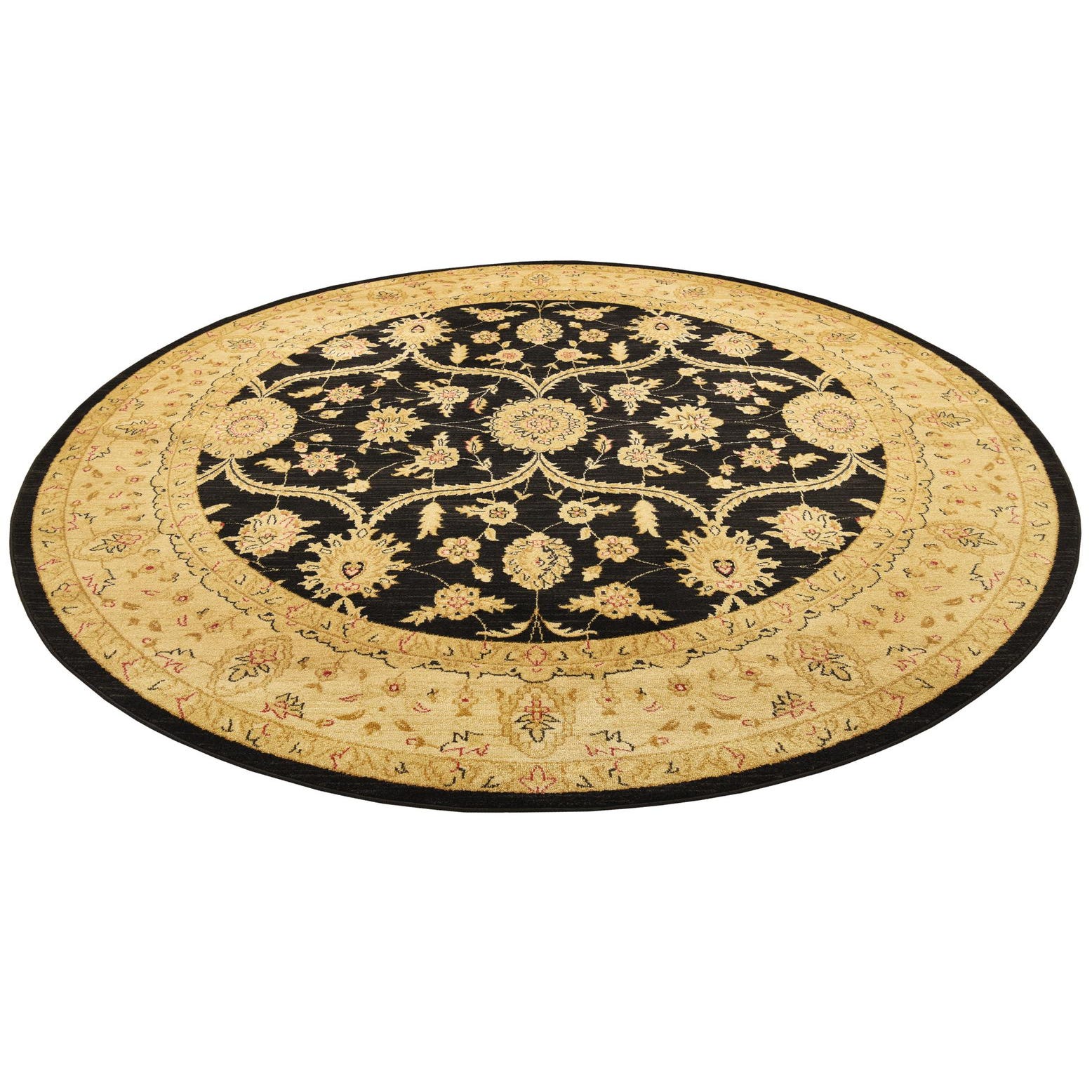 The Chelsea Collection offers a timeless elegance with a machine-woven construction of 100% polypropylene, ensuring durability and longevity. This 8 Ft Round rug presents a striking contrast with its deep black background and intricate pattern, highlighted by accents of cream, light brown, and rust red. The design features traditional motifs, creating a sense of classic sophistication suited to a variety of spaces.