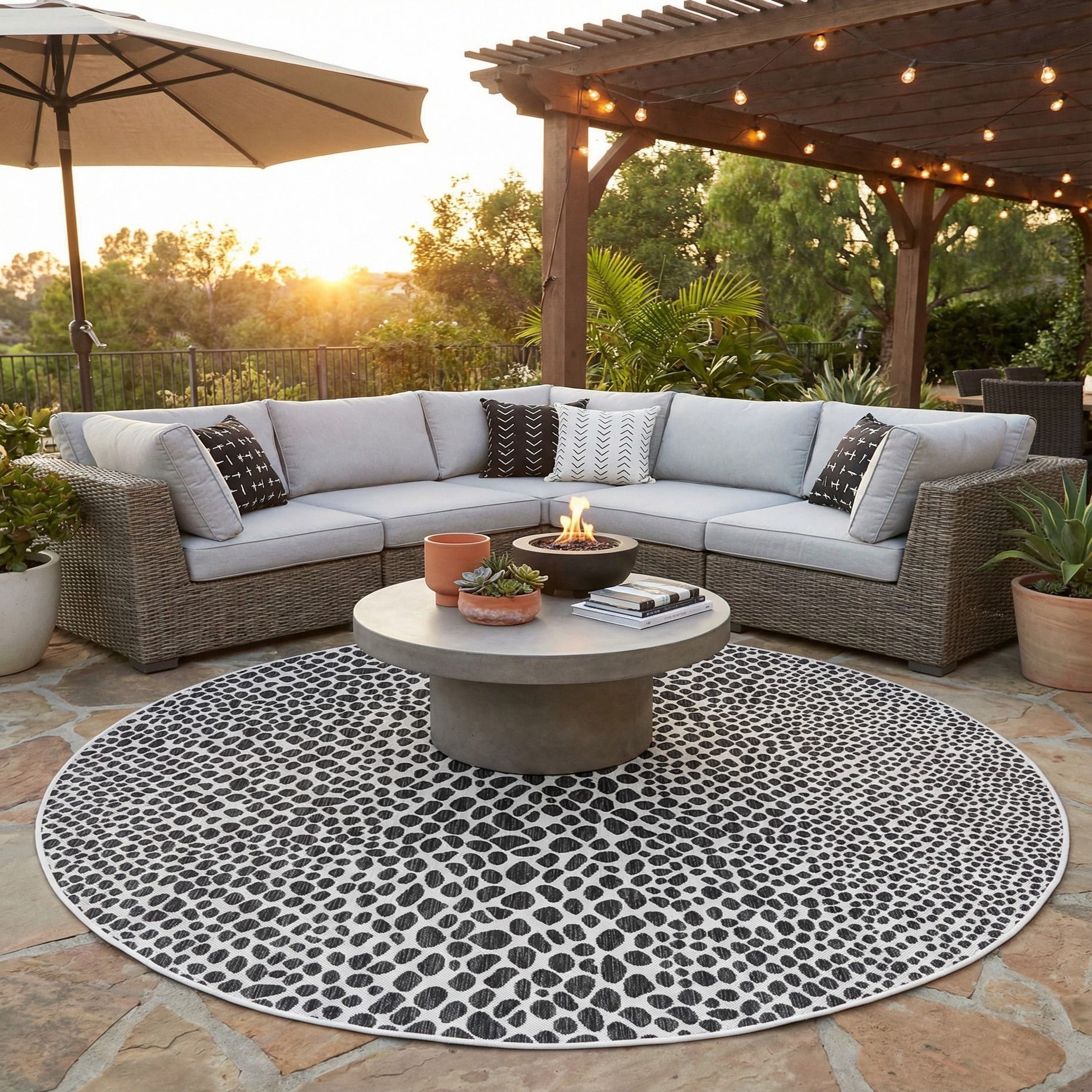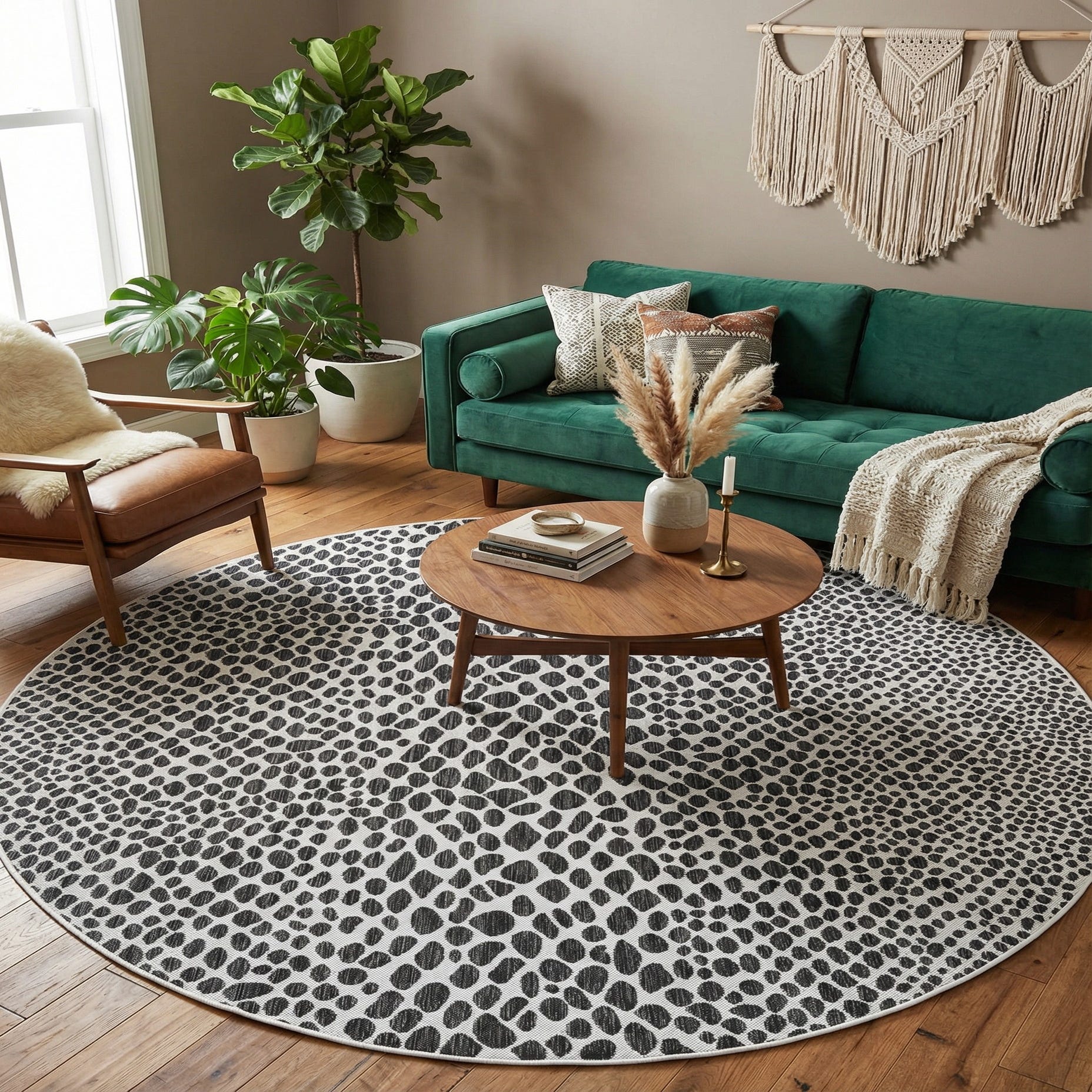 Pair this round piece with mixed-material furnishings—think light woods, black metal frames, or woven rattan—for a layered, modern look. It works well on a covered patio or sunroom as an outdoor-friendly statement, beneath a round dining table to define a dining nook, or in a living area where strong contrast and an organic pattern can ground neutral upholstery and leather accents.